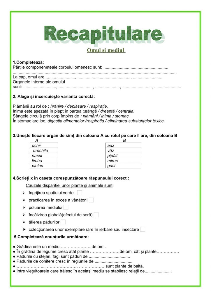 Academia ABC vă propune o fișă de lucru la unitatea OMUL ȘI MEDIUL care poate fi folosită atât la orele de recapitulare cât și la orele de evaluare la disciplina Științe.