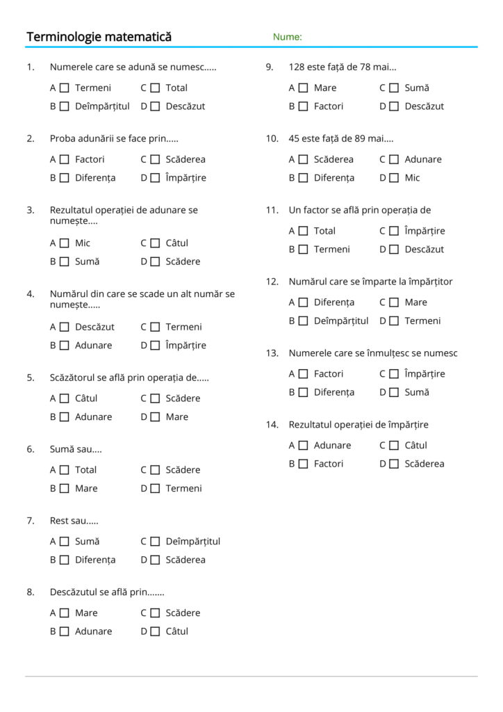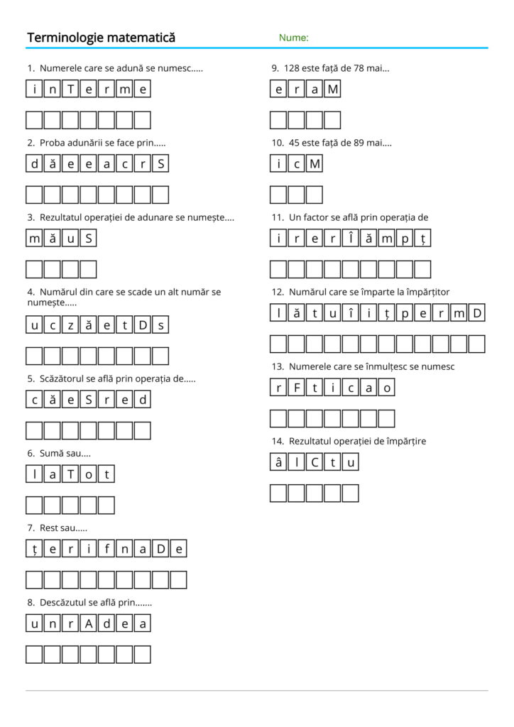 Academia ABC vă pune la dispoziție un set de 6 fișe de lucru cu titlul Terminologie matematică care cuprind exerciții identice în toate fișele, însă diferă desing-ul, fiecare cadru didactic/părinte poate alege fișa de lucru preferată. Materialul didactic este unul folositor pentru elevi care de cele mai multe ori întâmpină dificultăți în rezolvarea exercițiilor și problemelor la matematică datorită faptului că ei nu cunosc bine terminologia matematică specifică vârstei lor( clasele II-IV).