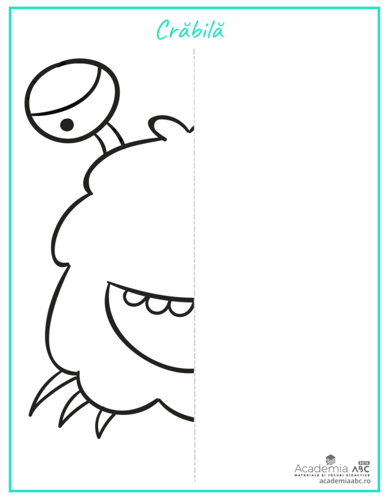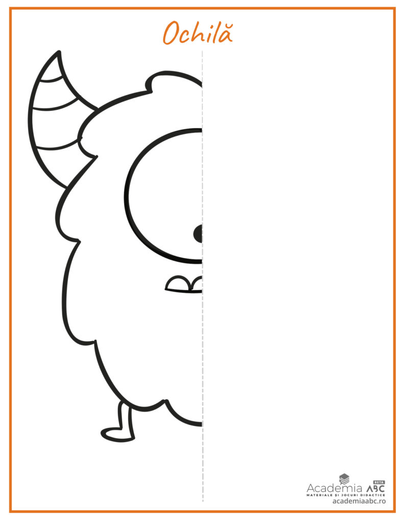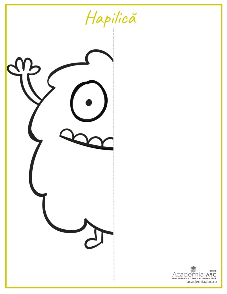 Așa-i că îți plac monstruleții, mai ales cei veseli și jucăuși? Atunci, ești un norocos deoarece ți-am pregătit o serie de fișe de lucru în care va trebui să completezi jumătate dintr-un monstruleț, iar apoi să îl colorezi. Poți să mai inviți încă patru prieteni și să vă distrați alături de Crăbilă, Dințosul, Hapilică, Ochilă și Supărilă.