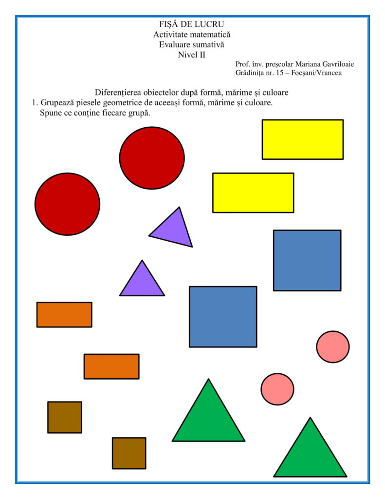 Evaluare semestrială-Activitate matematică(nivelul II)Grădiniță, Grupa mare, Grupă mijlocie / Autor AcademiaABC Fisa-de-lucru-evaluare-matematica-nivel-II-.pdf (1 Descărcări ) Gavriloaie MarianaProfesor învățământ preșcolar la Grădinița Nr. 15, Focșani, Vrancea, vechime de 38 ani; Distribuie pe: 0 Distribuiri Facebook 0 Email Imprimă Copiază legătura