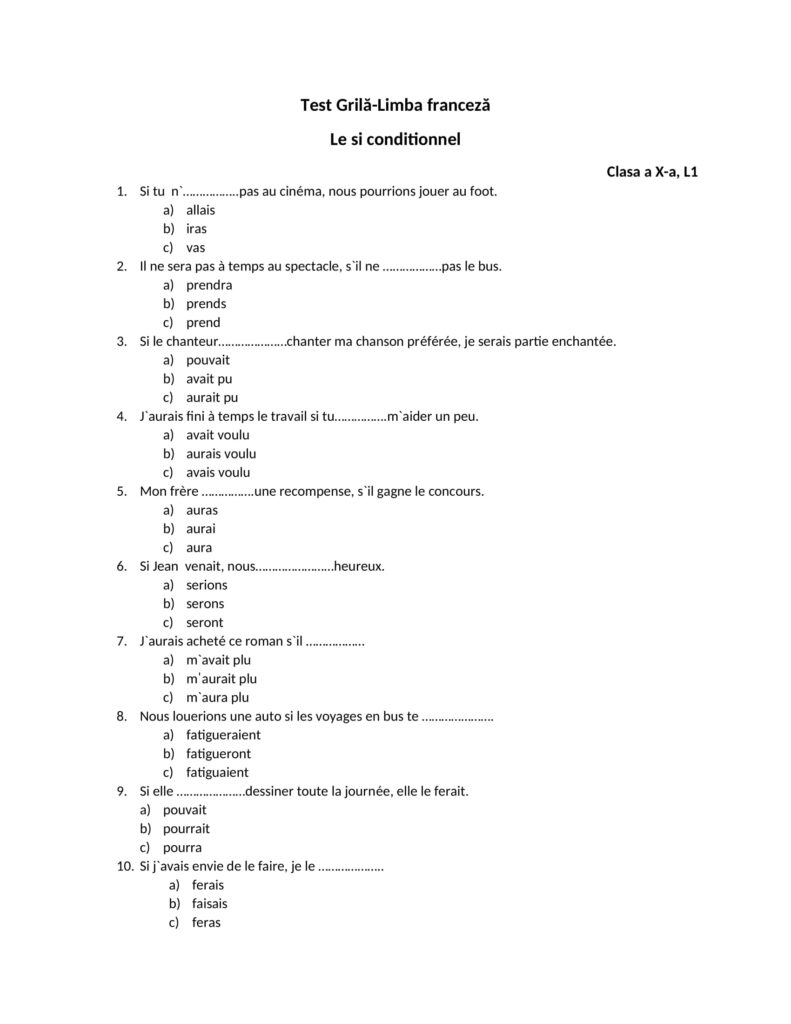 Test Grilă Limba franceză-Le si conditionnel, Clasa a X-a L1Clasa a X-a, Clasele liceale / Autor Sprîncenatu Monica le-si-conditionnel.docx (1310 Descărcări ) Detalii Autor Articole Autor Sprîncenatu Monica Autor Profesor de Limba franceză la Liceul Teoretic Emil Racoviță Vaslui; email [email protected] Test Grilă Limba franceză-Le si conditionnel, Clasa a X-a L120 iulie 2022 Sprîncenatu Monica Test Grilă Limba franceză-Les indéfinis, Clasa a X-a L1/L220 iulie 2022 Sprîncenatu Monica Distribuie pe: 0 Distribuiri Facebook 0 Email Imprimă Copiază legătura