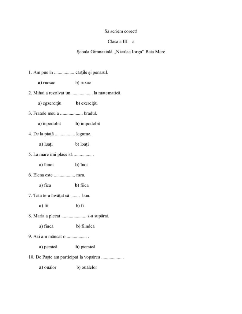 Să scriem corect! Test grilă Clasa a III-a Limba și literatura românăClasa a III-a, Clasele primare, Limba și literatura română / Autor Cadru didactic Sa-scriem-corect-grila.docx (1 Descărcări ) Florea MarianaProfesor învățământ primar la Şcoala Gimnazială ,,Nicolae Iorga" Baia Mare; Distribuie pe: 0 Distribuiri Facebook 0 Email Imprimă Copiază legătura