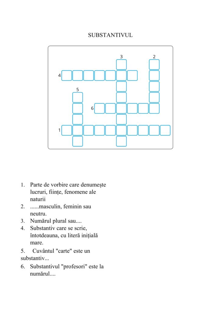 Cuvinte încrucișate-SubstantivulClasa a III-a, Clasa a IV-a, Clasele primare, Limba și literatura română / Autor Cadru didactic cuvinte-incrucisate_-Substantivul.docx (507 Descărcări ) Gavrilenco Mihaela CristinaProfesor învățământ primar la Școala Gimnazială Nr. 84 București; Distribuie pe: 0 Distribuiri Facebook 0 Email Imprimă Copiază legătura