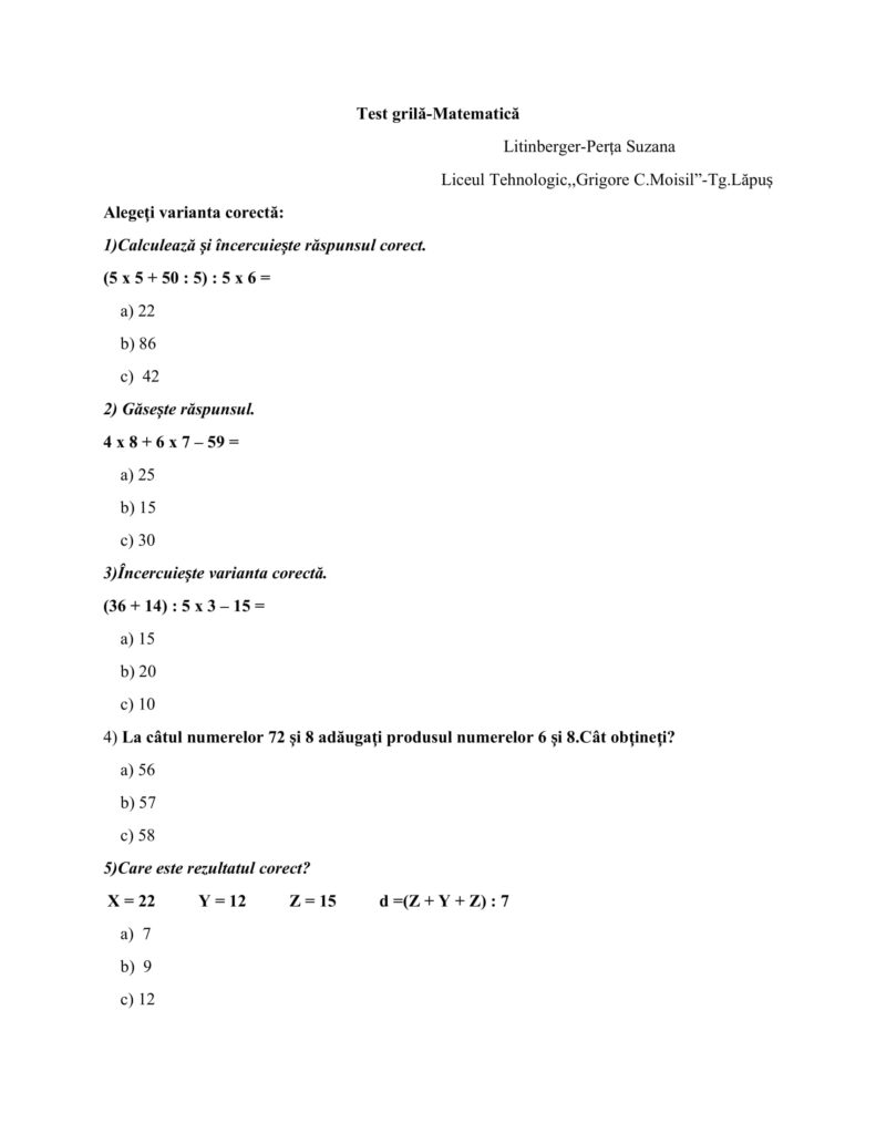 Test grilă-Matematică Clasa a III-aClasa a III-a, Clasele primare, Matematică / Autor Cadru didactic Test-grila-matematica-cls.III_.docx (1 Descărcări ) Litinberger-Perța SuzanaProfesor învățământ primar la Liceul Tehnologic ,,Grigore C.Moisil”; Distribuie pe: 0 Distribuiri Facebook 0 Email Imprimă Copiază legătura