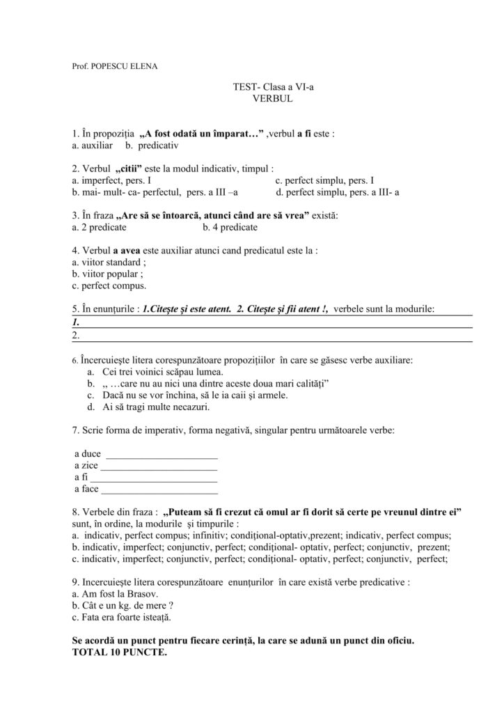 Evaluare Limba și literatura română-Verbul Clasa a VI-aClasa a VI-a, Clasele gimnaziale, Limba şi literatura română / Autor Cadru didactic Test-clasa-a-VI-a.doc (1 Descărcări ) Popescu ElenaProfesor de Limba și literatura română la Colegiul Național ,,Vladimir Streinu” Găești; Distribuie pe: 0 Distribuiri Facebook 0 Email Imprimă Copiază legătura