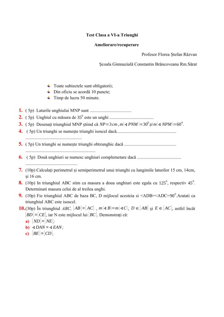 Test Clasa a VI-a Triunghi (Ameliorare/Recuperare)Clasa a VI-a, Clasele gimnaziale, Matematică / Autor Cadru didactic Test-clasa-a-VI-a-ameliorare-recuperare-Florea-Stefan-Razvan.docx (1 Descărcări ) Florea Ștefan RăzvanProfesor de Matematică la Școala Gimnazială Constantin Brâncoveanu Rm. Sărat; Distribuie pe: 0 Distribuiri Facebook 0 Email Imprimă Copiază legătura