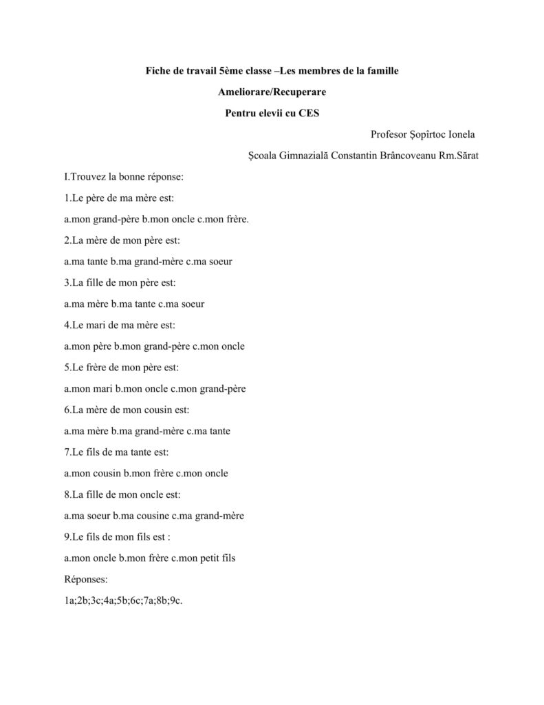 Fiche de travail 5ème classe-Les membres de la famille (Ameliorare/Recuperare)Clasa a V-a, Clasele gimnaziale / Autor Cadru didactic Fiche-de-travail-5eme-classe-Sopirtoc-Ionela-ameliorare.docx (1 Descărcări ) Șopîrtoc IonelaProfesor de Limba franceză la Școala Gimnazială Constantin Brâncoveanu Rm. Sărat; Distribuie pe: 0 Distribuiri Facebook 0 Email Imprimă Copiază legătura