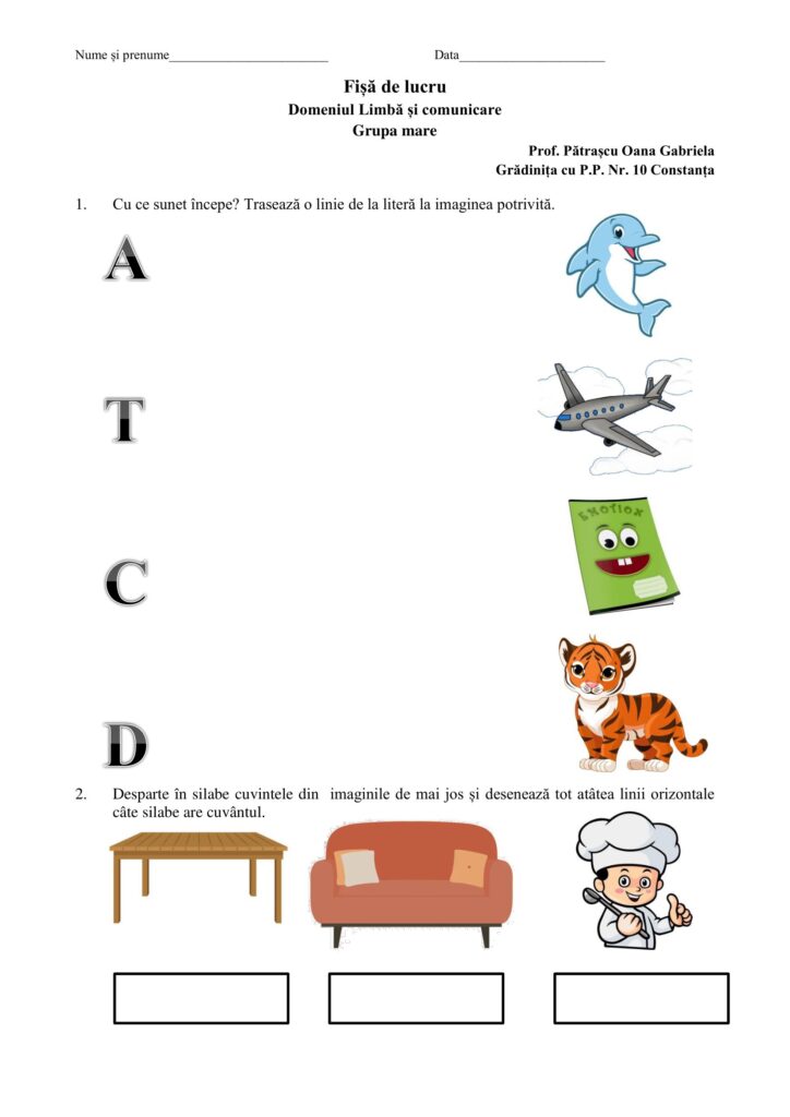 Fișă de lucru-Domeniul Limbă și comunicare Grupa mareGrădiniță, Grupa mare / Autor Cadru didactic Fisa-de-lucru-DLC-1.pdf (415 Descărcări ) Pătrașcu Oana GabrielaProfesor învățământ preșcolar la Grădinița cu Program Prelungit Nr. 10 Constanța; Distribuie pe: 0 Distribuiri Facebook 0 Email Imprimă Copiază legătura