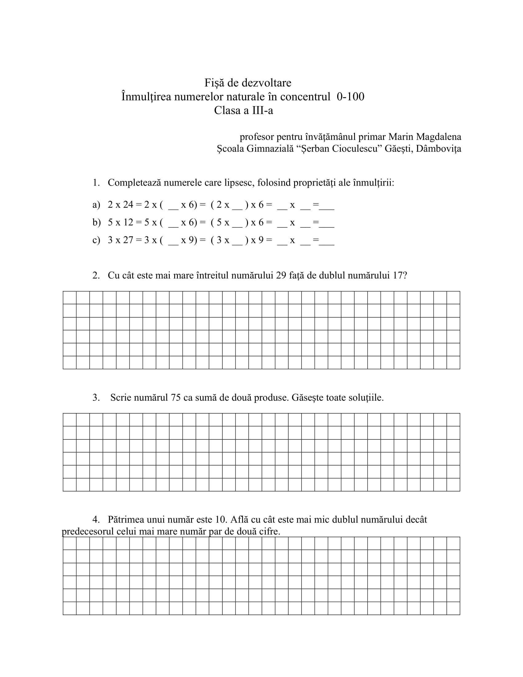 Fișă de dezvoltare Clasa a III-a Înmulțirea numerelor naturale în concentrul 0-100