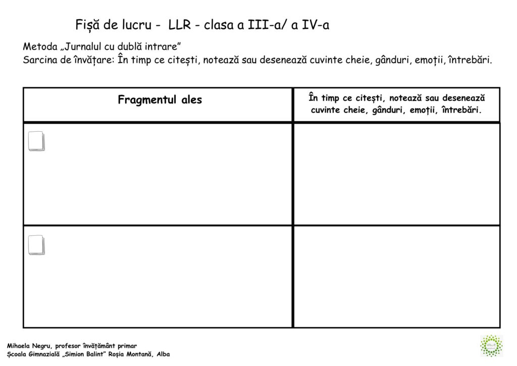 Fișă de lucru – Limba și literatura română Clasa a III-a/a IV-a(2)Clasa a III-a, Clasa a IV-a, Clasele primare, Limba și literatura română / Autor Cadru didactic Fisa_de_lucru_Mihaela_Negru-2.pdf (302 Descărcări ) Negru MihaelaProfesor învățământ primar la Școala Gimnazială „Simion Balint” Roșia Montană, Alba; Distribuie pe: 0 Distribuiri Facebook 0 Email Imprimă Copiază legătura