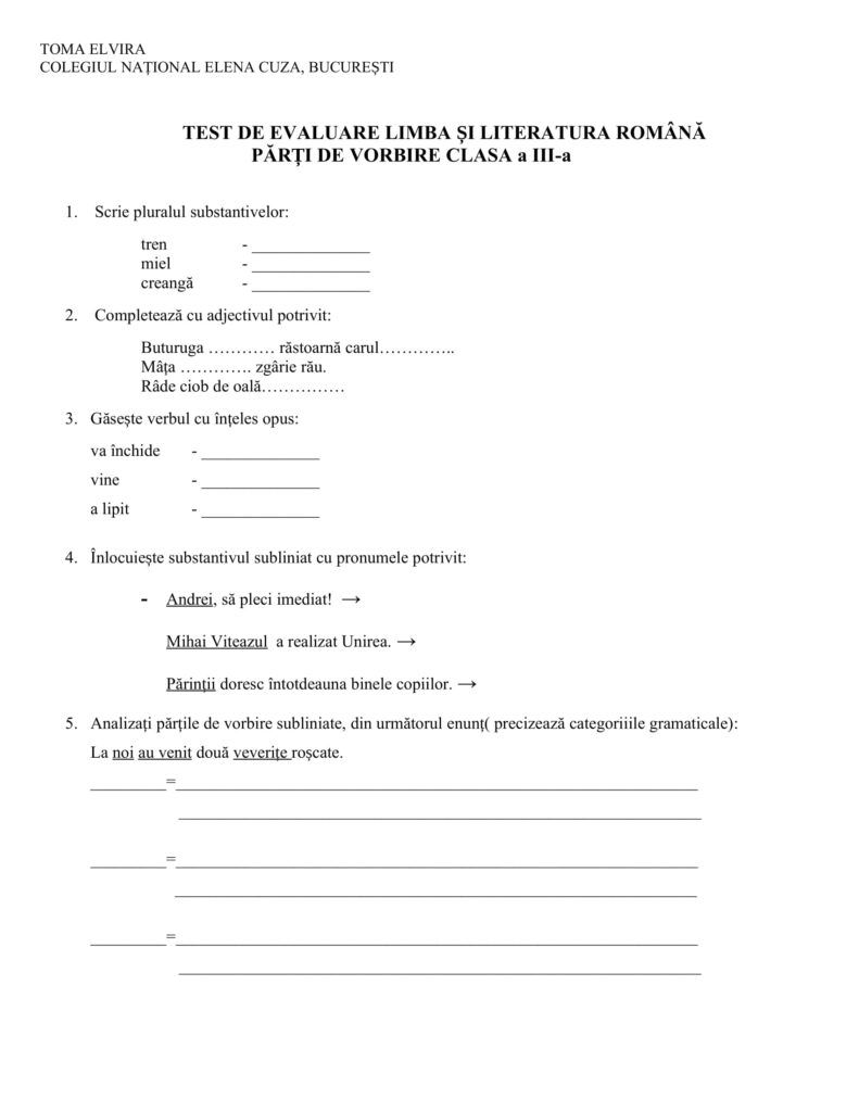 Test de evaluare Limba șI literatura română Părți de vorbire Clasa a III-aClasa a III-a, Clasele primare, Limba și literatura română / Autor Cadru didactic test-de-evaluare-parti-de-vorbire.docx (1 Descărcări ) Toma ElviraProfesor învățământ primar la Colegiul Național Elena Cuza, București; Distribuie pe: 0 Distribuiri Facebook 0 Email Imprimă Copiază legătura
