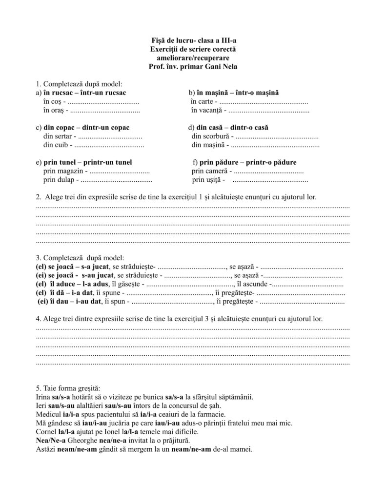 Fișă de lucru Clasa a III-a Exerciții de scriere corectă(Ameliorare/Recuperare)Clasa a III-a, Clasele primare, Limba și literatura română / Autor Cadru didactic Fisa-de-lucru-clasa-a-III-a-Exercitii-de-scriere-corecta-ameliorare.docx (810 Descărcări ) Gani NelaProfesor învățământ primar la Școala Gimnazială nr. 1 Eforie Nord, 38 ani vechime; Distribuie pe: 0 Distribuiri Facebook 0 Email Imprimă Copiază legătura