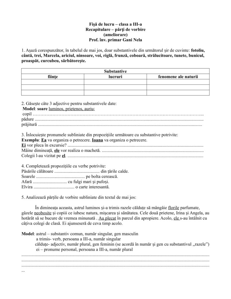 Fișă de lucru Clasa a III-a Recapitulare Părți de vorbire(Ameliorare)Clasa a III-a, Clasele primare, Limba și literatura română / Autor Cadru didactic Fisa-de-lucru-clasa-a-III-a-Parti-de-vorbire-ameliorare.docx (1 Descărcări ) Gani NelaProfesor învățământ primar la Școala Gimnazială nr. 1 Eforie Nord, 38 ani vechime; Distribuie pe: 0 Distribuiri Facebook 0 Email Imprimă Copiază legătura