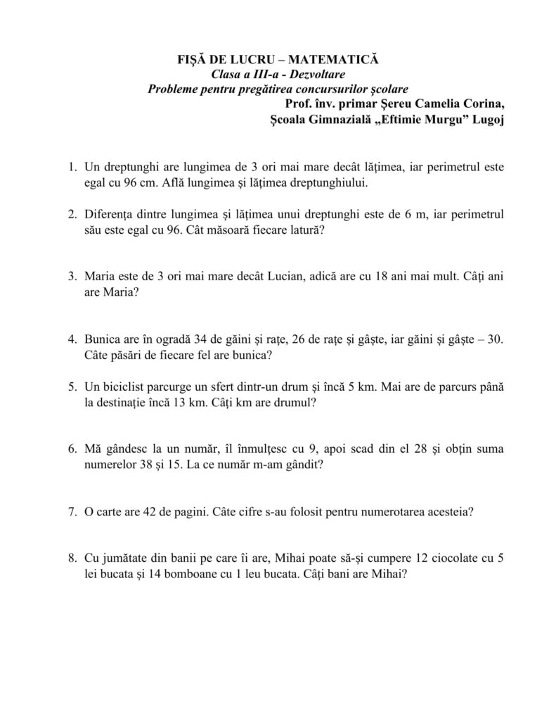 Fișă de lucru Clasa a III-a Probleme pentru pregătirea concursurilor școlare(Dezvoltare)Clasa a III-a, Clasele primare, Matematică / Autor Cadru didactic Fisa-de-lucru-matematica-dezvoltare-_cls-3.docx (403 Descărcări ) Șereu Camelia CorinaProfesor învățământ primar la Școala Gimnazială „Eftimie Murgu” Lugoj, 30 ani vechime; Distribuie pe: 35 Distribuire Facebook 35 Email Imprimă Copiază legătura