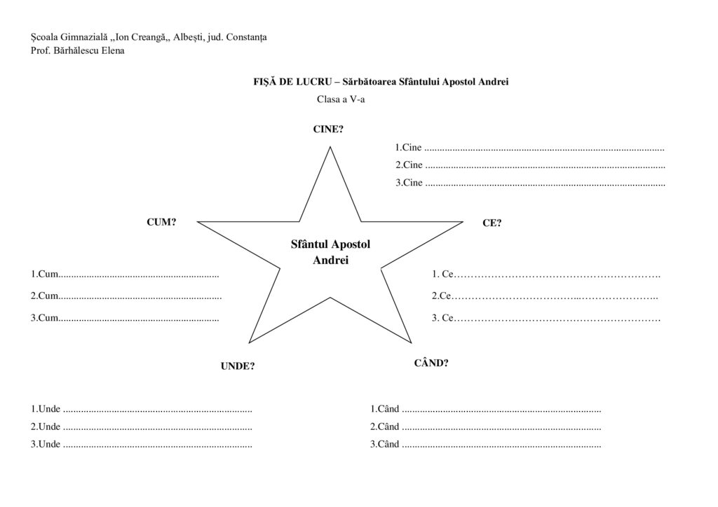 Fișă de lucru Religie-Sărbătoarea Sfântului Apostol AndreiClasa a V-a, Clasele gimnaziale, Religie / Autor Cadru didactic Fisa-de-lucru-Sf.-Ap.-Andrei.docx (1 Descărcări ) Bărhălescu ElenaProfesor de Religie la Școala Gimnazială ,,Ion Creangă,, Albești, jud. Constanța; Distribuie pe: 0 Distribuiri Facebook 0 Email Imprimă Copiază legătura