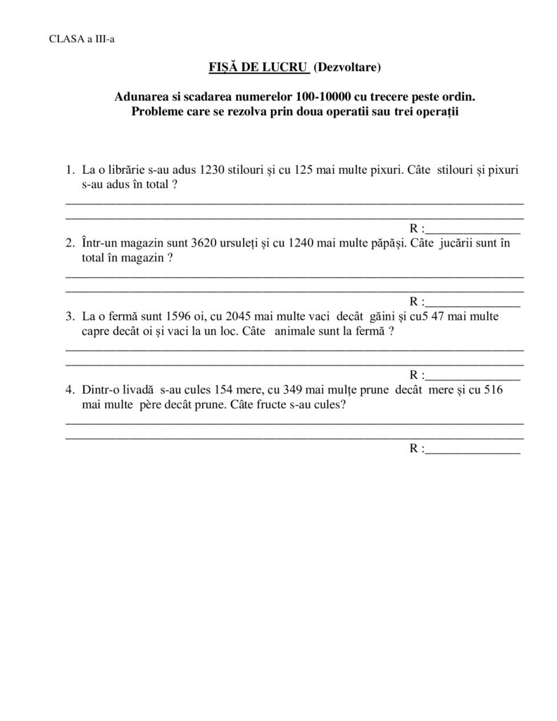 Adunarea și scădarea numerelor 100-10000 cu trecere peste ordin. Probleme care se rezolvă prin două operații sau trei operații(Dezvoltare)Clasa a III-a, Clasele primare, Matematică / Autor Cadru didactic fise-variante-ISTOC-SILVIA.docx (514 Descărcări ) SILVIA-ISTOC-ABC.docx (1 Descărcări ) Silvia IștocProfesor învățământ primar la Liceul Vocațional Pedagogic Nicolae Bolcaș Beiuș; Distribuie pe: 0 Distribuiri Facebook 0 Email Imprimă Copiază legătura