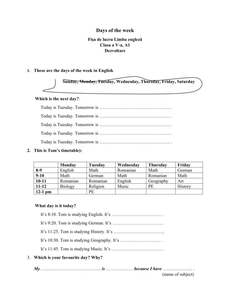 Fişă de lucru Limba engleză Clasa a V-a A1 Days of the week (Dezvoltare)Clasa a V-a, Clasele gimnaziale, Limba engleză / Autor Cadru didactic Days-of-the-week.docx (1 Descărcări ) Aldea Simona DorinaProfesor de Limba engleză la Școala Gimnazială ,,Aurel Mosora" Sighișoara; Distribuie pe: 0 Distribuiri Facebook 0 Email Imprimă Copiază legătura