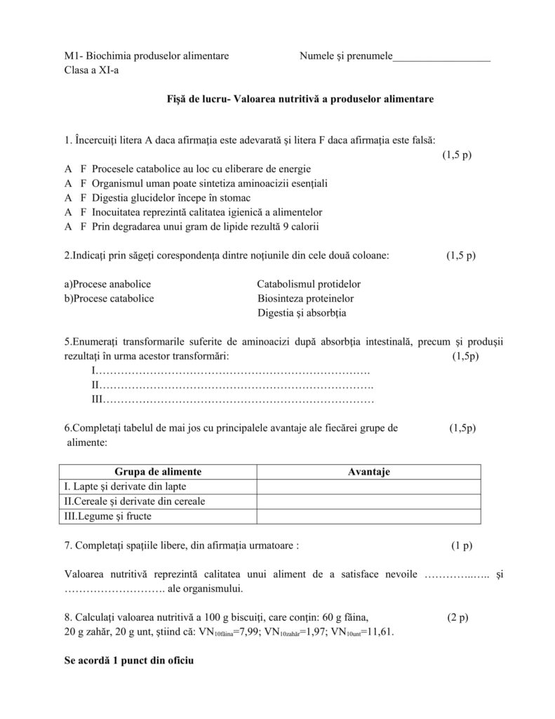 Fişa de lucru Clasa a XI-a Valoarea nutritivă a produselor alimentareClasa a XI-a, Clasele liceale / Autor Cadru didactic fisa-de-lucru-valoarea-nutritiva-a-produselor-alimentare.doc (1 Descărcări ) Gal Alina MariaProfesor specialitate-Industrie alimentară la Colegiul Tehnic ,,Ioan Ciordaș" Beiuș; Distribuie pe: 0 Distribuiri Facebook 0 Email Imprimă Copiază legătura