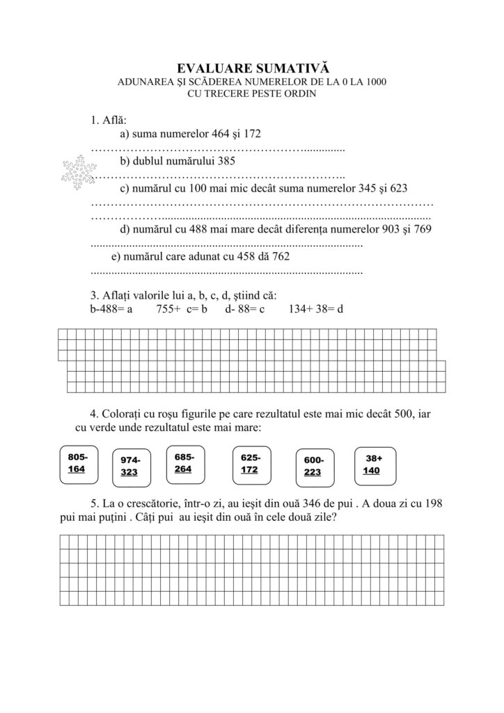 Evaluare sumativă-Adunarea și scăderea numerelor naturale de la 0 la 1000 cu trecere peste ordin