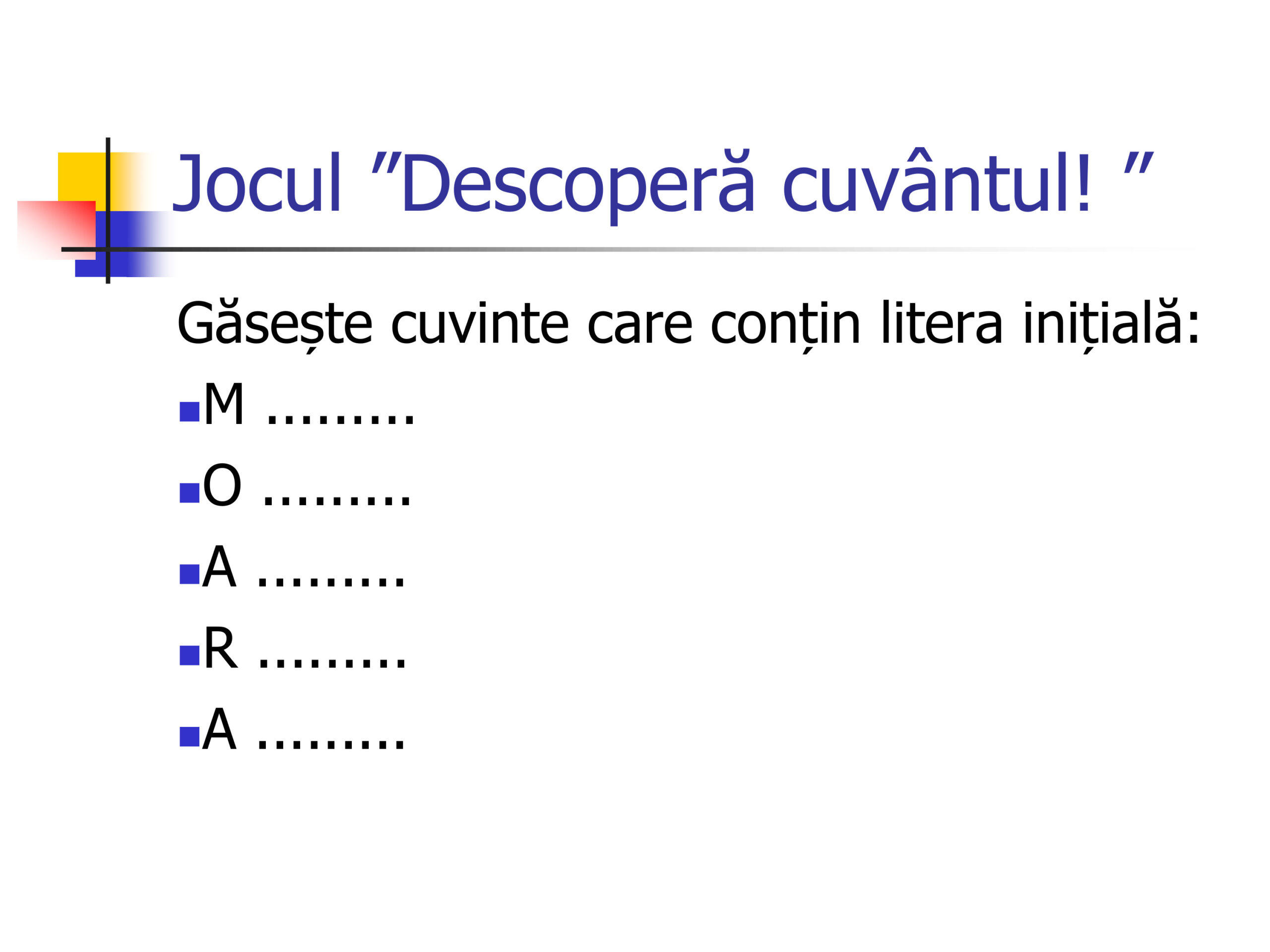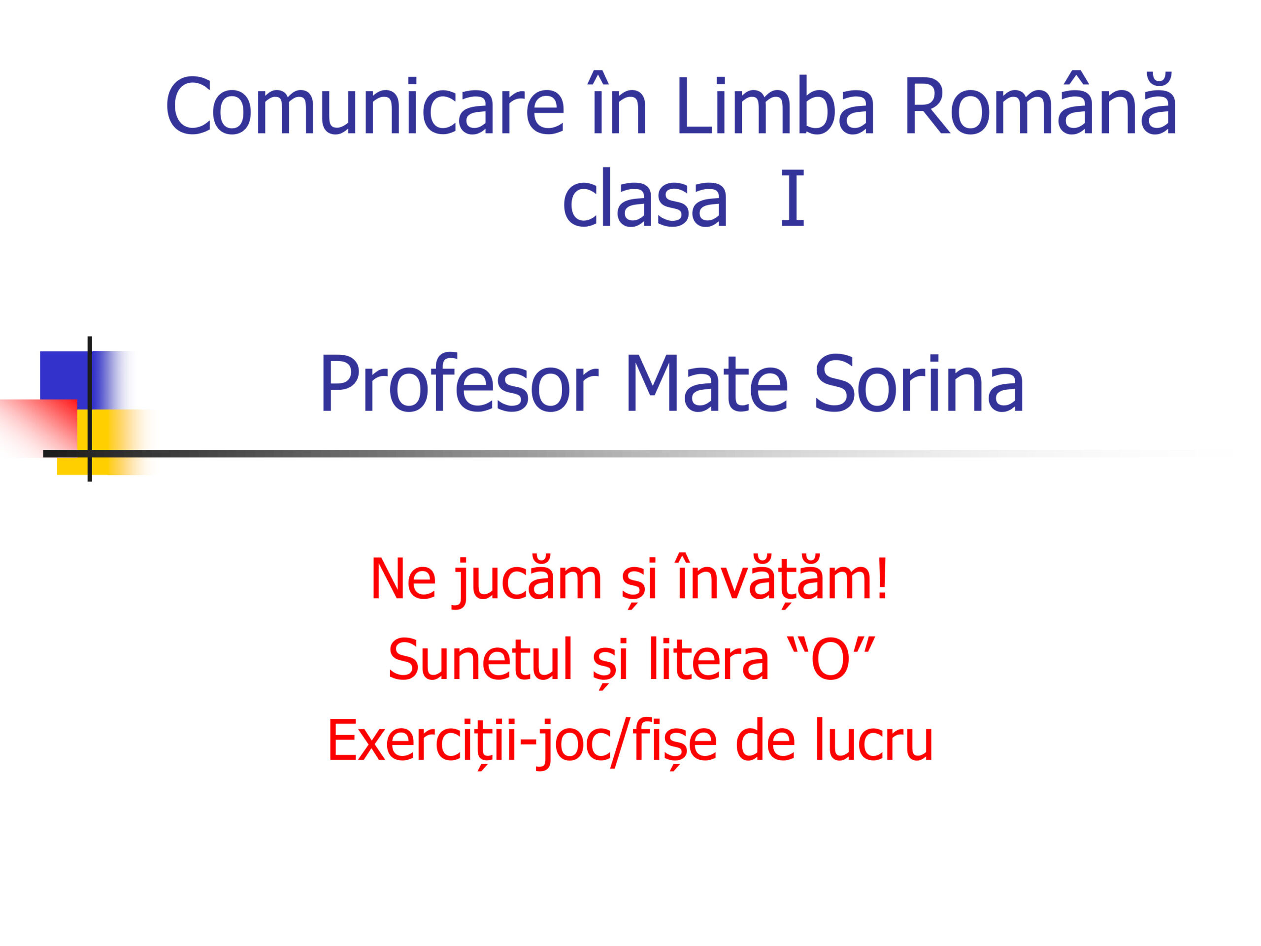 Ne jucăm și învățăm! Sunetul și litera “O”Clasa I, Clasele primare, Comunicare în limba română / Autor Cadru didactic Materialul poate fi vizualizat și descărcat integral din secțiunea de mai jos: Descărcări Sunetul-si-litera-O.ppt (1 Descărcări ) Mate SorinaProfesor psihopedagog la Liceul Special pentru Deficienți de Vedere, Buzău; Distribuie pe: 0 Distribuiri Facebook 0 Email Imprimă Copiază legătura