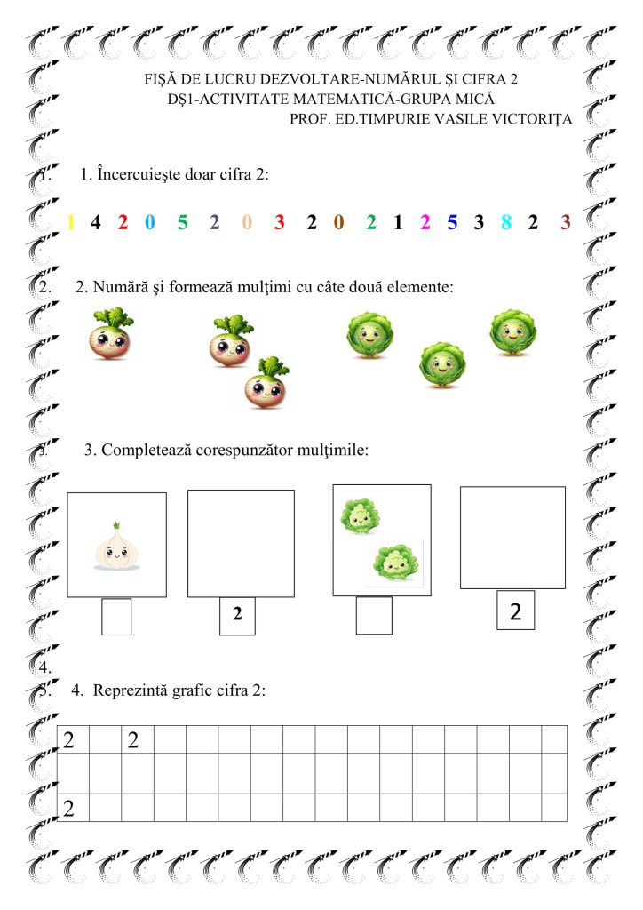 Fișă de lucru Grupa mică-Numărul și cifra 2 (Dezvoltare)Grădiniță, Grupa mică / Autor Cadru didactic NUMARUL-SI-CIFRA-2-PROF-VASILE-VICTORITA-GRADINITA-NR-230.docx (1 Descărcări ) Vasile VictoriţaProfesor pentru Educaţie Timpurie la Grădiniţa Nr. 230, gradul didactic II; Distribuie pe: 0 Distribuiri Facebook 0 Email Imprimă Copiază legătura