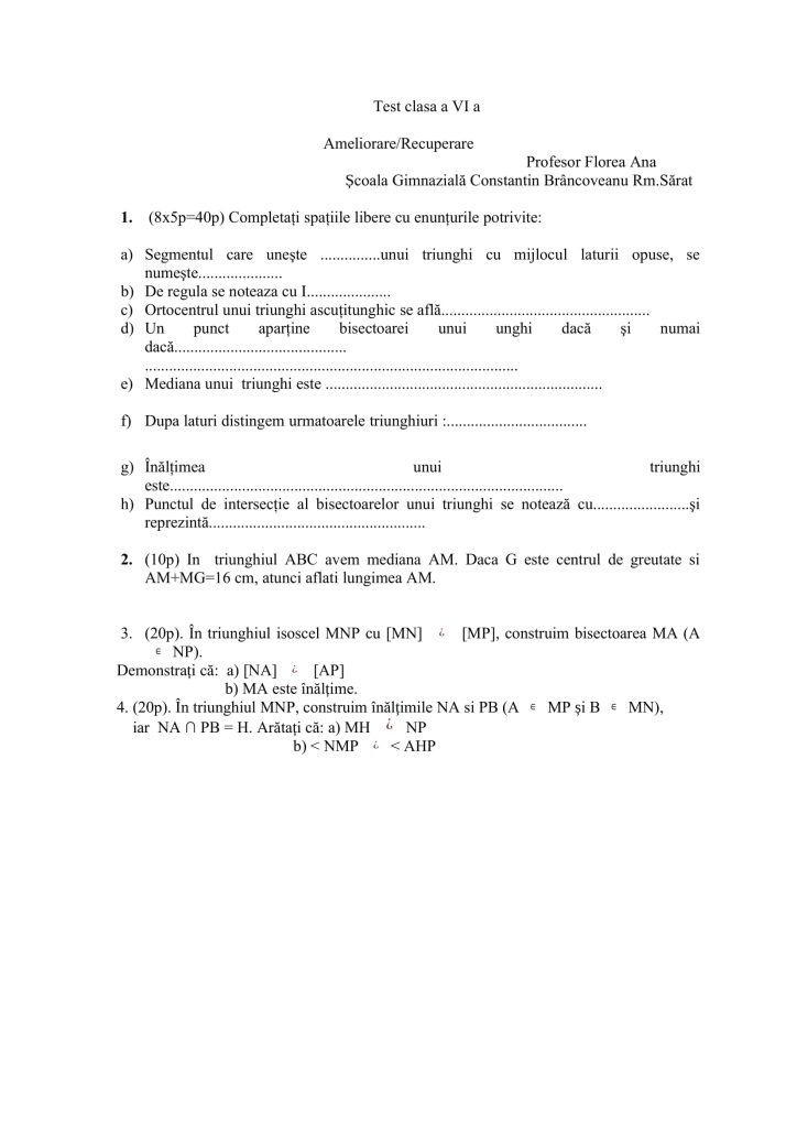 Test Clasa a VI-a (Ameliorare/Recuperare)Clasa a VI-a, Clasele gimnaziale, Matematică / Autor Cadru didactic Test-cls-a-6-a-Ameliorare-Recuperare.docx (1 Descărcări ) Florea Ana MariaProfesor de matematică la Școala Gimnazială Constantin Brancoveanu, Rm. Sărat; Distribuie pe: 0 Distribuiri Facebook 0 Email Imprimă Copiază legătura