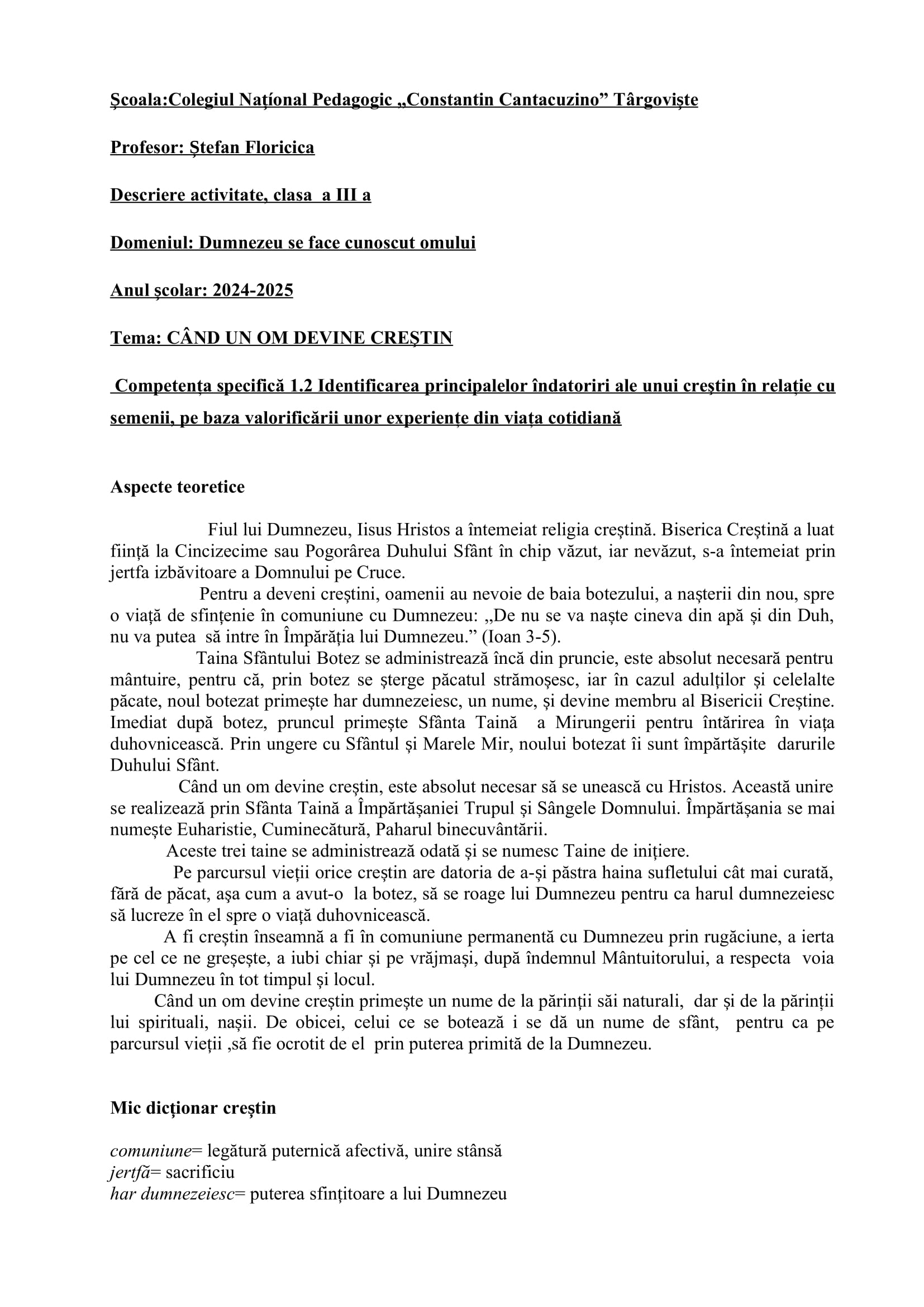 Activitate Clasa a III-a Când un om devine creștinClasa a III-a, Clasele primare / Autor Cadru didactic Cand-un-om-devine-crestin.docx (1 Descărcări ) Ștefan FloricicaProfesor Religie la Colegiul Național Pedagogic ”Constantin Cantacuzino” Târgoviște; Distribuie pe: 0 Distribuiri Facebook 0 Email Imprimă Copiază legătura