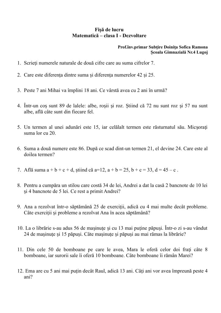 Fișă de lucru Matematică Clasa I (Dezvoltare)Clasa I, Clasele primare, Matematică / Autor Cadru didactic Fisa-de-lucru-Matematica-Clasa-I-Dezvoltare.docx (1 Descărcări ) Subțire Doinița Sofica RamonaProfesor învățământ primar la Școala Gimnazială Nr.4 Lugoj; Distribuie pe: 0 Distribuiri Facebook 0 Email Imprimă Copiază legătura