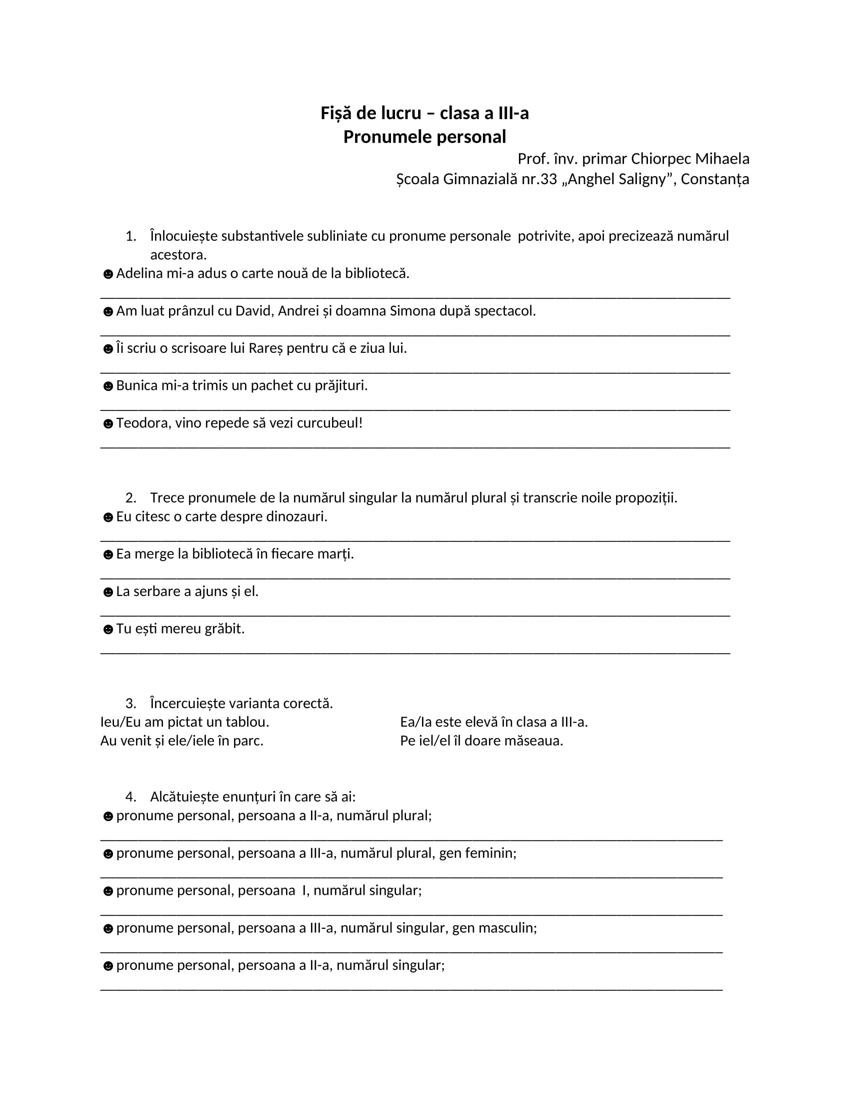 Fișă de lucru Clasa a III-a Pronumele personalClasa a III-a, Clasele primare / Autor Cadru didactic Pronumele-personal.docx (617 Descărcări ) Chiorpec MihaelaProfesor învățământ primar la Școala Gimnazială Nr. 33 „Anghel Saligny”, Constanța; Distribuie pe: 0 Distribuiri Facebook 0 Email Imprimă Copiază legătura