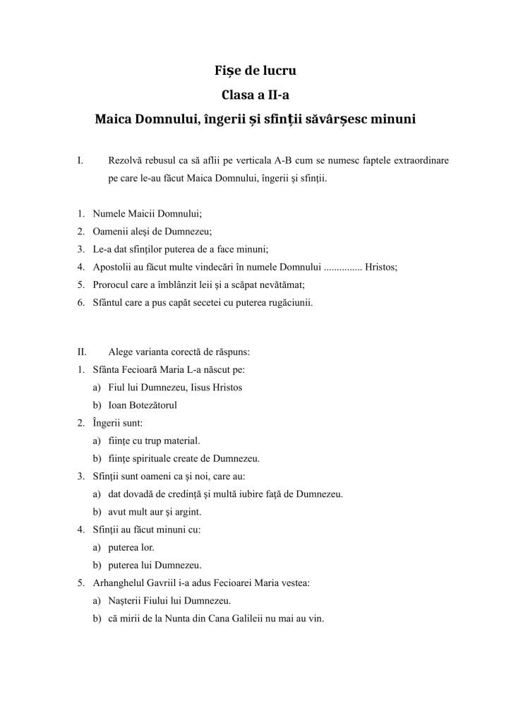 Fișă de lucru Religie Clasa a II-a Maica Domnului, îngerii și sfinții săvârșesc minuniClasa a II-a, Clasele primare / Autor Cadru didactic fisa_de_lucru-2.docx (1 Descărcări ) Lipovanu CosminProfesor de Religie ortodoxă la Liceul Teoretic ,,Mihai Veliciu” Chișineu-Criș; Distribuie pe: 0 Distribuiri Facebook 0 Email Imprimă Copiază legătura