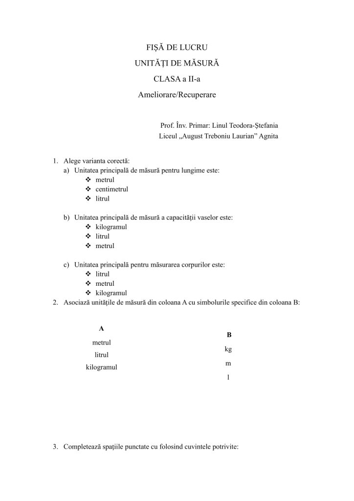 Fișă de lucru Clasa a II-a Unități de măsură (Ameliorare/Recuperare)Clasa a II-a, Clasele primare, Matematică / Autor Cadru didactic FISA-DE-LUCRU-Clasa-a-II-a-UNITATI-DE-MASURA.docx (1 Descărcări ) Linul Teodora ȘtefaniaProfesor învățământ primar la Liceul „August Treboniu Laurian” Agnita; Distribuie pe: 0 Distribuiri Facebook 0 Email Imprimă Copiază legătura