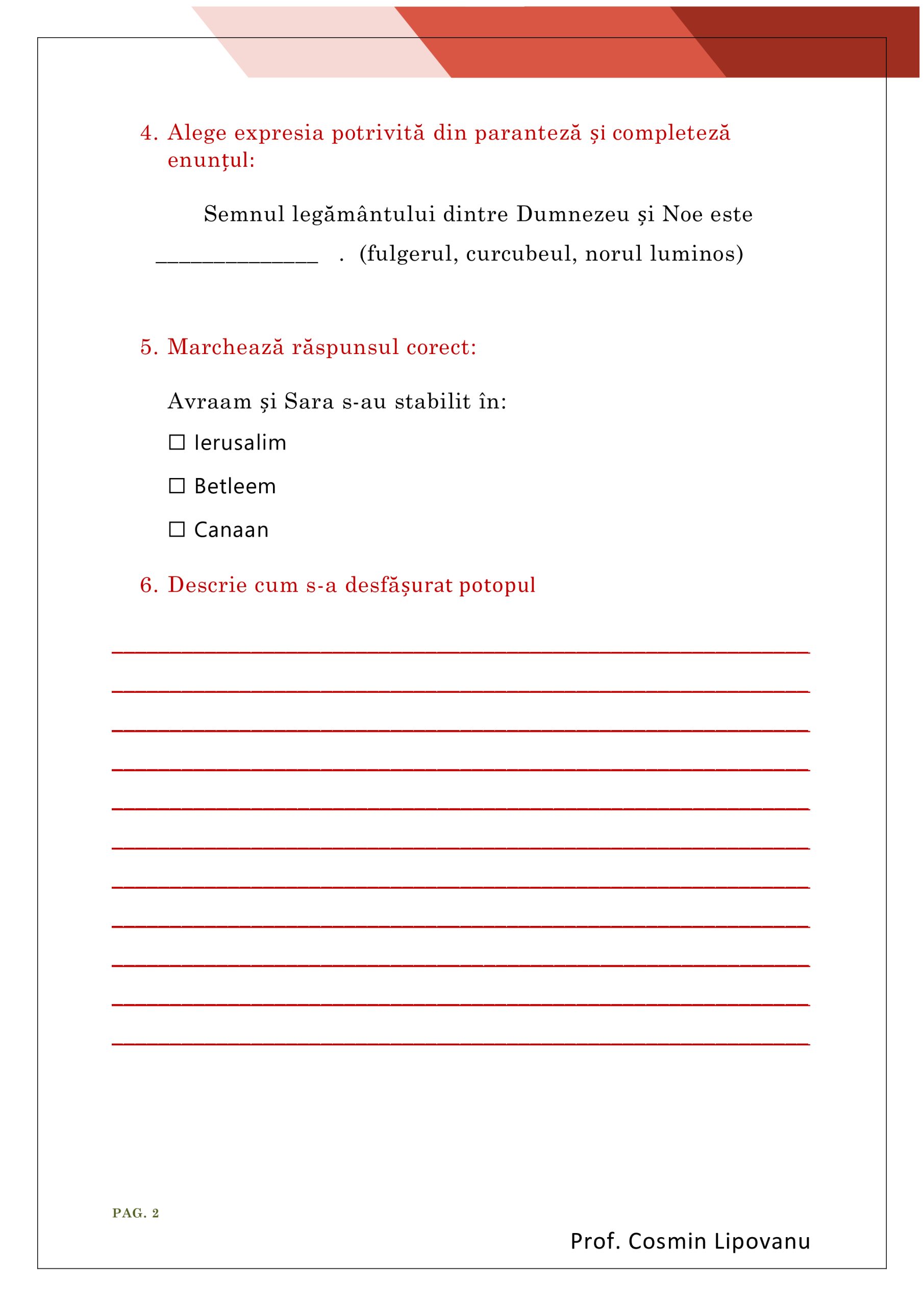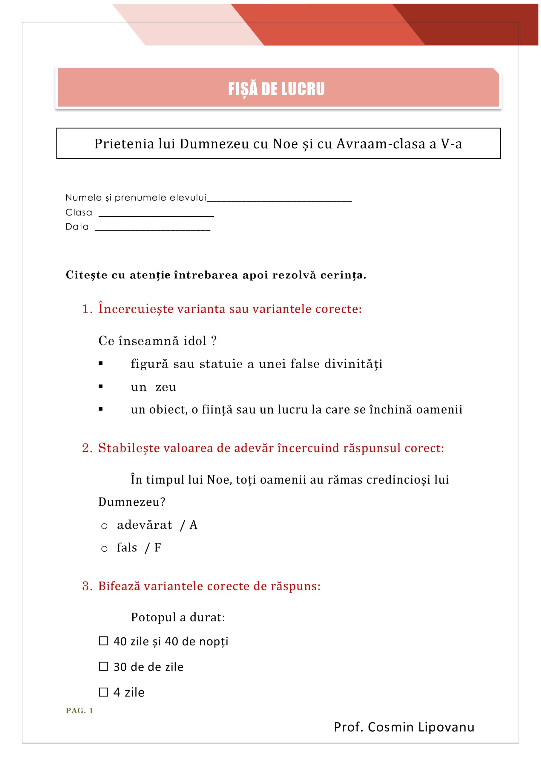 Fișă de lucru Clasa a V-a Prietenia lui Dumnezeu cu Noe și cu AvraamClasa a V-a, Religie, Religie / Autor Cadru didactic Prietenia_lui_Dumnezeu_c_-Noe_clasa_a_V_a.docx (1 Descărcări ) Lipovanu CosminProfesor de Religie ortodoxă la Liceul Teoretic ,,Mihai Veliciu” Chișineu-Criș; Distribuie pe: 0 Distribuiri Facebook 0 Email Imprimă Copiază legătura