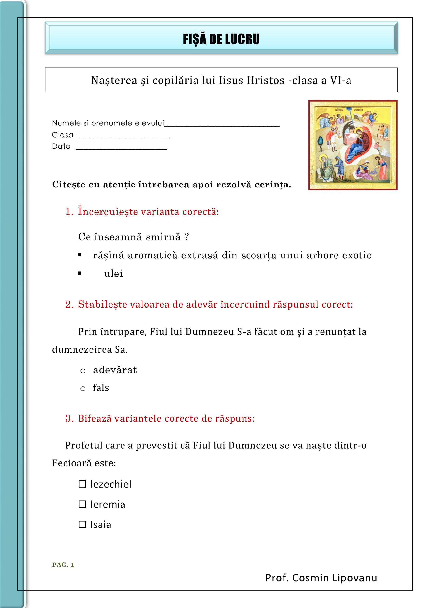 Fișă de lucru Clasa a VI-a Nașterea și copilăria lui Iisus HristosClasa a VI-a, Religie / Autor Cadru didactic Nasterea_Domnului_clasa_a_VI_a.docx (1 Descărcări ) Lipovanu CosminProfesor de Religie ortodoxă la Liceul Teoretic ,,Mihai Veliciu” Chișineu-Criș; Distribuie pe: 0 Distribuiri Facebook 0 Email Imprimă Copiază legătura