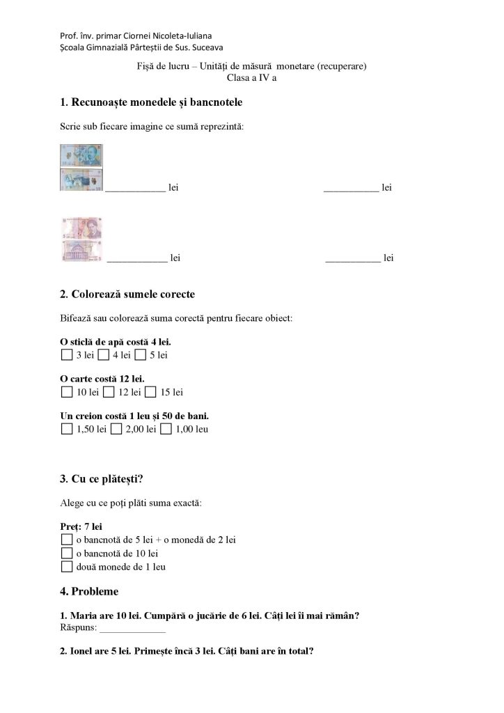 Fișă de lucru Clasa a IV-a Unități de măsură monetare (Recuperare)Clasa a IV-a, Clasele primare, Matematică / Autor Cadru didactic Fisa-de-lucru-recuperare.docx (1 Descărcări ) Ciornei Nicoleta IulianaProfesor învățământ primar la Școala Gimnazială Pârteștii de Sus, Suceava; Distribuie pe: 0 Distribuiri Facebook 0 Email Imprimă Copiază legătura