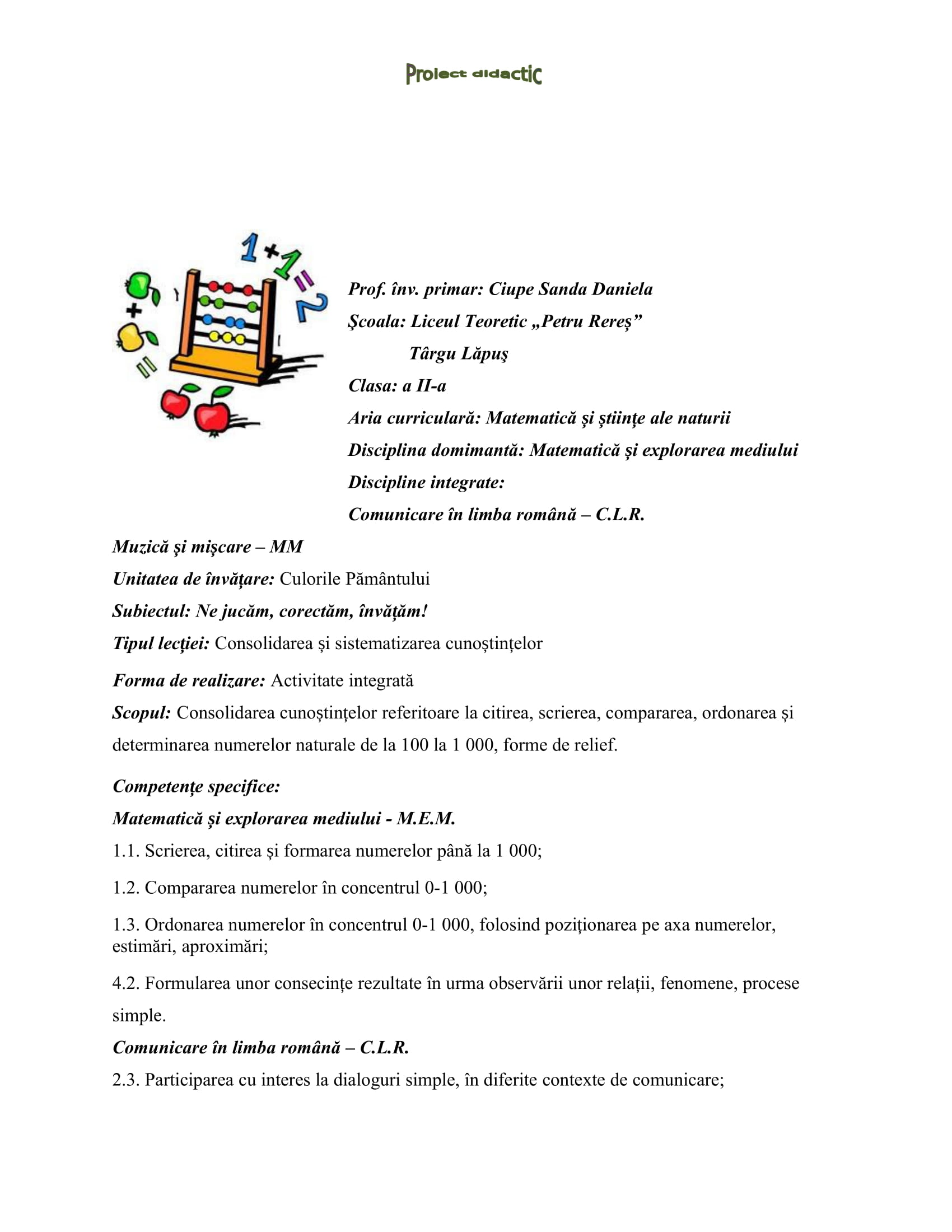 Proiect didactic Matematică și explorarea mediului Clasa a II-a Ne jucăm, corectăm, învățăm!Clasa a II-a, Clasele primare, Explorarea mediului, Mapa învățătorului, Matematică, Modele Proiecte didactice / Autor Cadru didactic proiect-MEM.docx (117 Descărcări ) Ciupe Sanda-DanielaProfesor învățământ primar la Liceul Teoretic „Petru Rareș” Târgu Lăpuș; Distribuie pe: 0 Distribuiri Facebook 0 Email Imprimă Copiază legătura