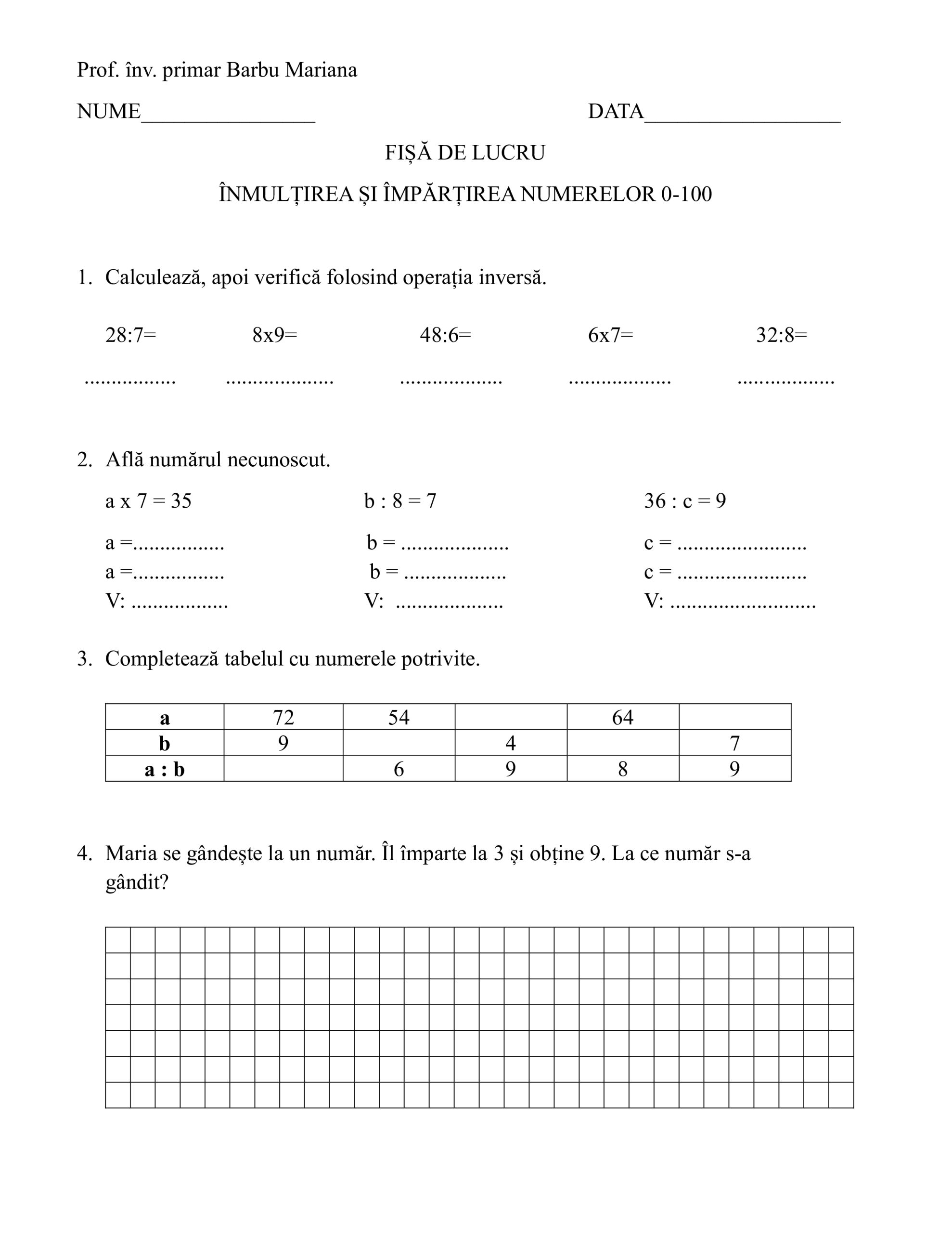 Fișă de lucru Înmulțirea și împărțirea numerelor 0-100 (Ameliorare/Recuperare)Clasa a II-a, Clasele primare, Matematică / Autor Cadru didactic Inmultirea-si-impartirea-numerelor-0-100-ameliorare-recuperare.docx (319 Descărcări ) Barbu Mariana TeodoraProfesor învățământ primar la Școala Gimnazială ”Emil Racoviță”, București; Distribuie pe: 0 Distribuiri Facebook 0 Email Imprimă Copiază legătura