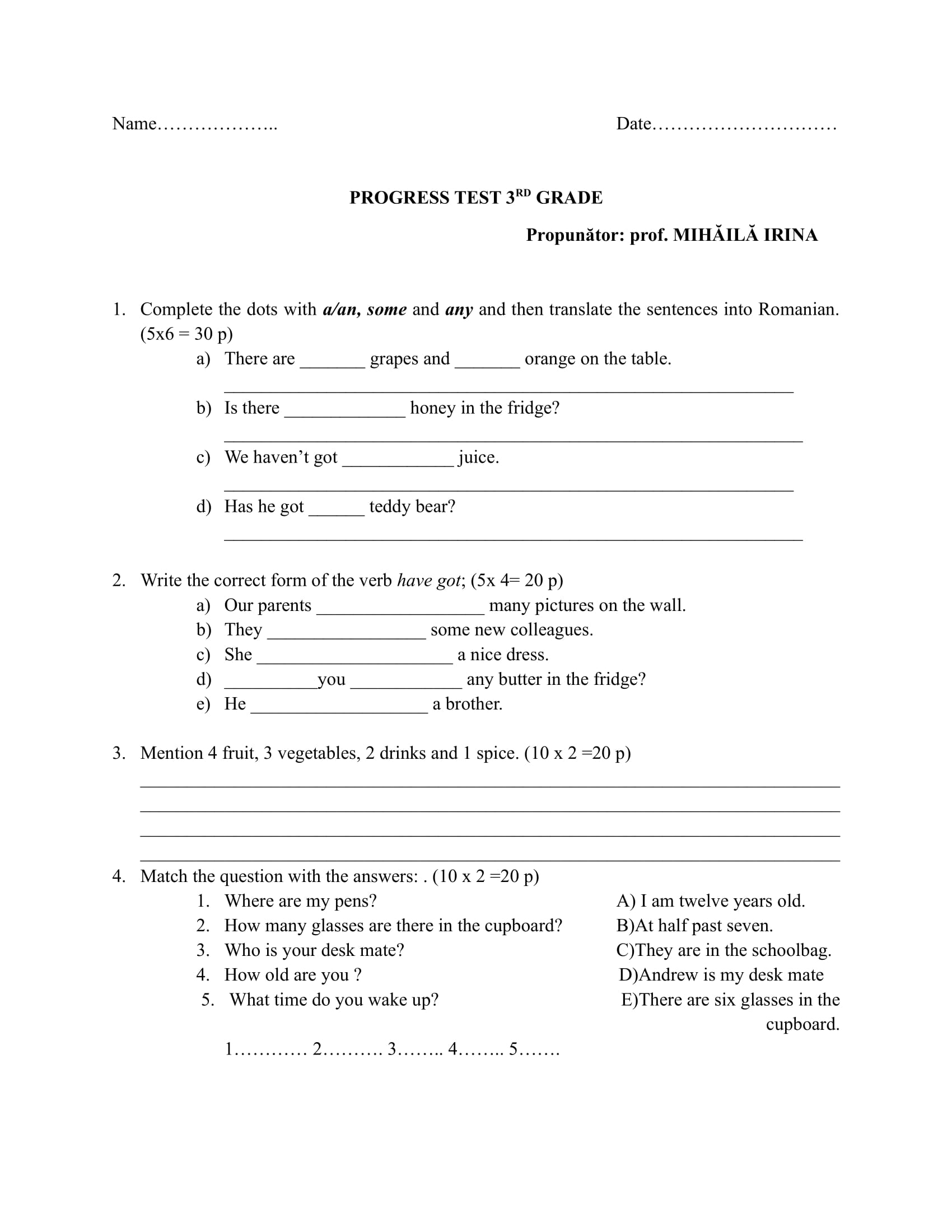 Progress Test 3rd GradeClasa a III-a, Clasele primare / Autor Cadru didactic PROGRESS-TEST-3RD-GRADE_-MIHAILA-IRINA.docx (1 Descărcări ) Mihăilă IrinaProfesor de Limba engleză la Școala Gimnazială ,,Dora Dalles" Bucșani, județul Dâmbovița; Distribuie pe: 0 Distribuiri Facebook 0 Email Imprimă Copiază legătura