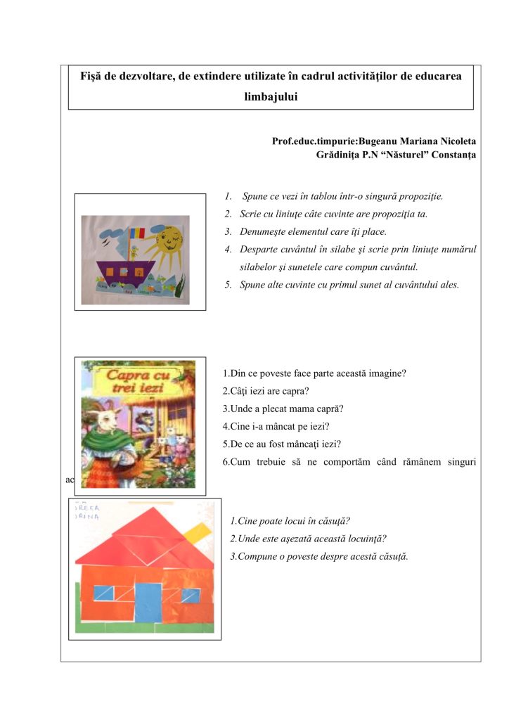 Fişă de dezvoltare, de extindere utilizate în cadrul activităţilor de educareaEducație Timpurie, Grădiniță / Autor Cadru didactic Fise-RED-Diferentiat-2.docx (1 Descărcări ) Bugeanu Mariana NicoletaProfesor educație timpurie la Grădiniţa P.N “Năsturel” Constanţa, vechime 30 de ani; Distribuie pe: 0 Distribuiri Facebook 0 Email Imprimă Copiază legătura