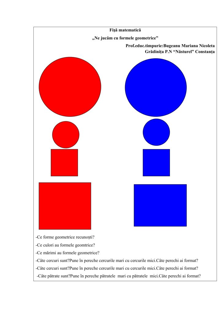 Fişă matematică-„Ne jucăm cu formele geometrice”Educație Timpurie, Grădiniță / Autor Cadru didactic Fise-RED-1.docx (1 Descărcări ) Bugeanu Mariana NicoletaProfesor educație timpurie la Grădiniţa P.N “Năsturel” Constanţa, vechime 30 de ani; Distribuie pe: 0 Distribuiri Facebook 0 Email Imprimă Copiază legătura