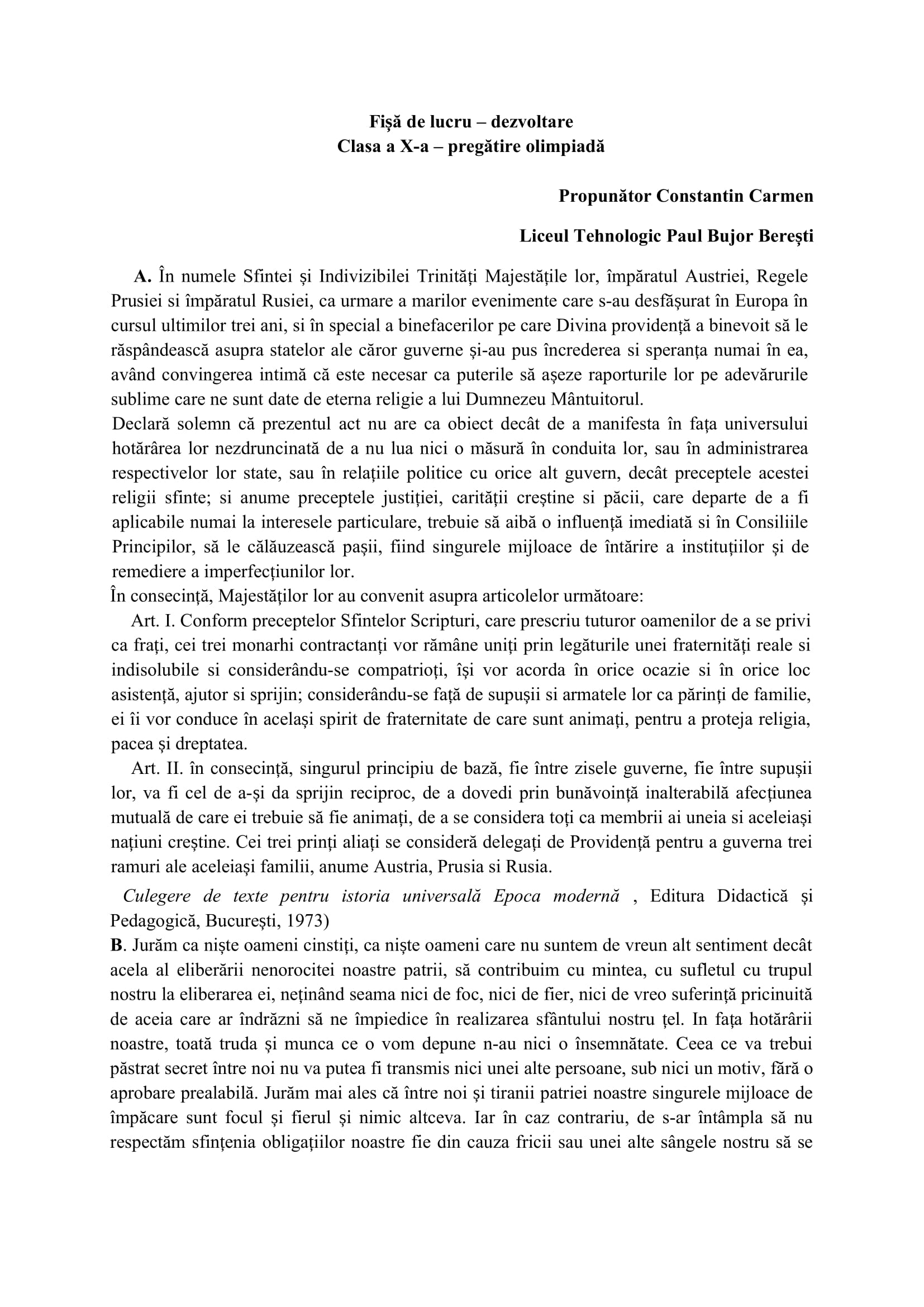 Fișă de lucru Istorie Clasa a X-a Pregătire olimpiadă (Dezvoltare)Clasa a X-a, Clasele liceale / Autor Cadru didactic Fisa-de-lucru-clasa-a-X-a-diferentiata.docx (1 Descărcări ) Constantin CarmenProfesor de Istorie la Liceul Tehnologic Paul Bujor Berești; Distribuie pe: 0 Distribuiri Facebook 0 Email Imprimă Copiază legătura