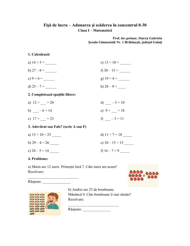 Fișă de lucru Clasa I Matematică– Adunarea și scăderea în concentrul 0-30Clasa I, Clasele primare, Matematică / Autor Cadru didactic Fisa_de_lucru_adunari_si_scaderi_0-30.docx (1 Descărcări ) Sturzu GabrielaProfesor învățământ primar la Școala Gimnazială Nr. 1 Brăhășești; Distribuie pe: 0 Distribuiri Facebook 0 Email Imprimă Copiază legătura