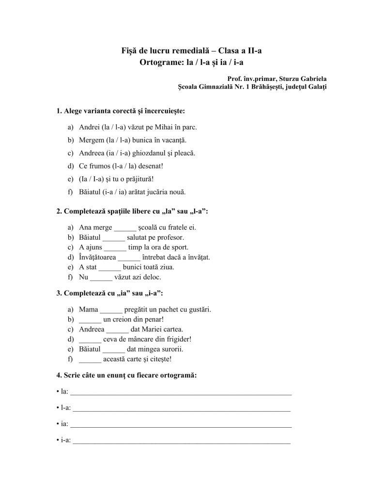 Fișă de lucru remedială Clasa a II-a Ortograme: la / l-a și ia / i-aClasa a II-a, Clasele primare, Comunicare în limba română / Autor Cadru didactic Fisa_de_lucru_remediala_ortogramele_LA_IA.docx (1 Descărcări ) Sturzu GabrielaProfesor învățământ primar la Școala Gimnazială Nr. 1 Brăhășești; Distribuie pe: 0 Distribuiri Facebook 0 Email Imprimă Copiază legătura