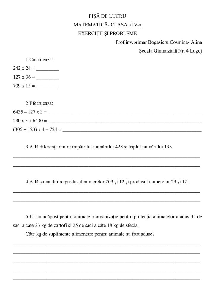 Fișă de lucru Clasa a IV-a Matematică-Exerciții și problemeClasa a IV-a, Clasele primare, Matematică / Autor Cadru didactic Fisa-de-lucru-Exercitii-si-probleme-clasa-a-IV-a.pdf (1 Descărcări ) Bogasieru Cosmina-AlinaProfesor învățământ primar la Școala Gimnazială Nr. 4 Lugoj; Distribuie pe: 0 Distribuiri Facebook 0 Email Imprimă Copiază legătura