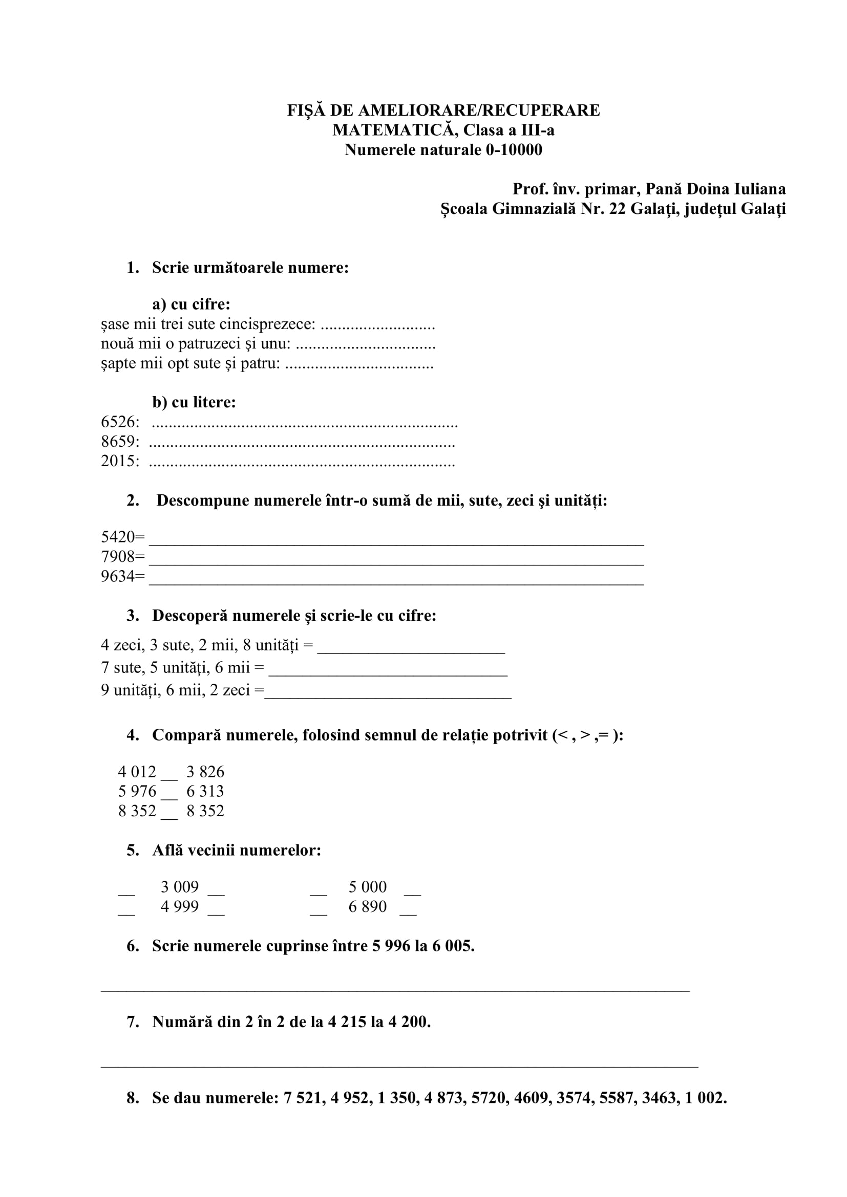 Fișă de lucru Matematică Clasa a III-a Numerele naturale 0-10000 (Ameliorare/Recuperare)Clasa a III-a, Clasele primare, Matematică / Autor Cadru didactic Fisa_de_ameliorare_recuperare_Matematica_Numerele_in_concentrul_0-10000_Clasa-a-III-a.docx (1 Descărcări ) Pană Doina IulianaProfesor învățământ primar la Școala Gimnazială Nr. 22, Galați; Distribuie pe: 0 Distribuiri Facebook 0 Email Imprimă Copiază legătura