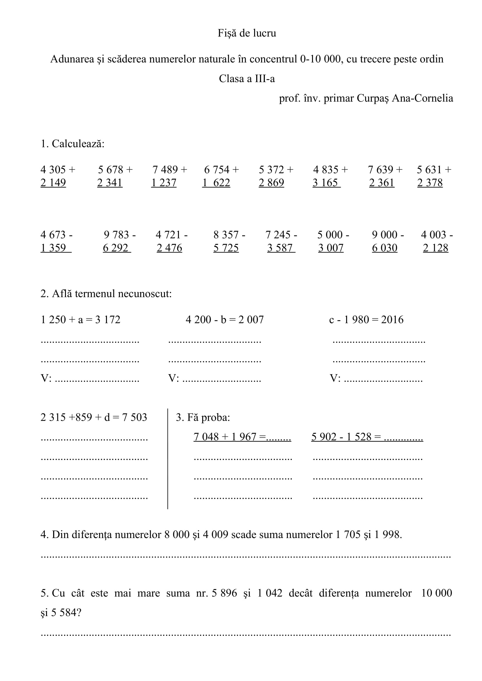 Fișă de lucru Clasa a III-a Adunarea și scăderea numerelor naturale în concentrul 0-10 000, cu trecere peste ordin (Dezvoltare)Clasa a III-a, Clasele primare, Matematică / Autor Cadru didactic Fisa-de-lucru-Matematica-Clasa-a-III-a-Dezvoltare.doc (1 Descărcări ) Curpaș Ana-CorneliaProfesor învățământ primar la Școala Gimnazială ”Oltea Doamna” Oradea; Distribuie pe: 0 Distribuiri Facebook 0 Email Imprimă Copiază legătura
