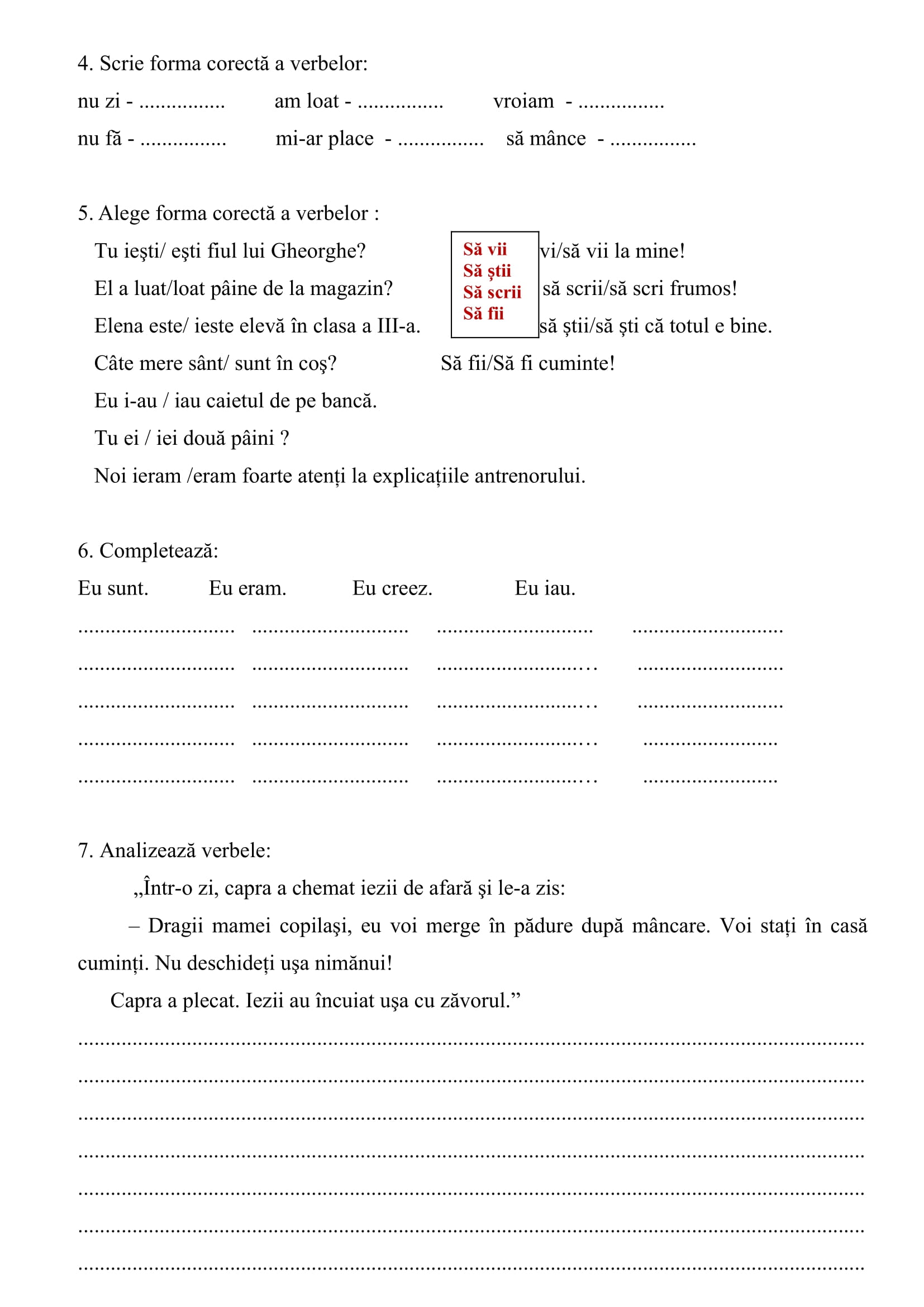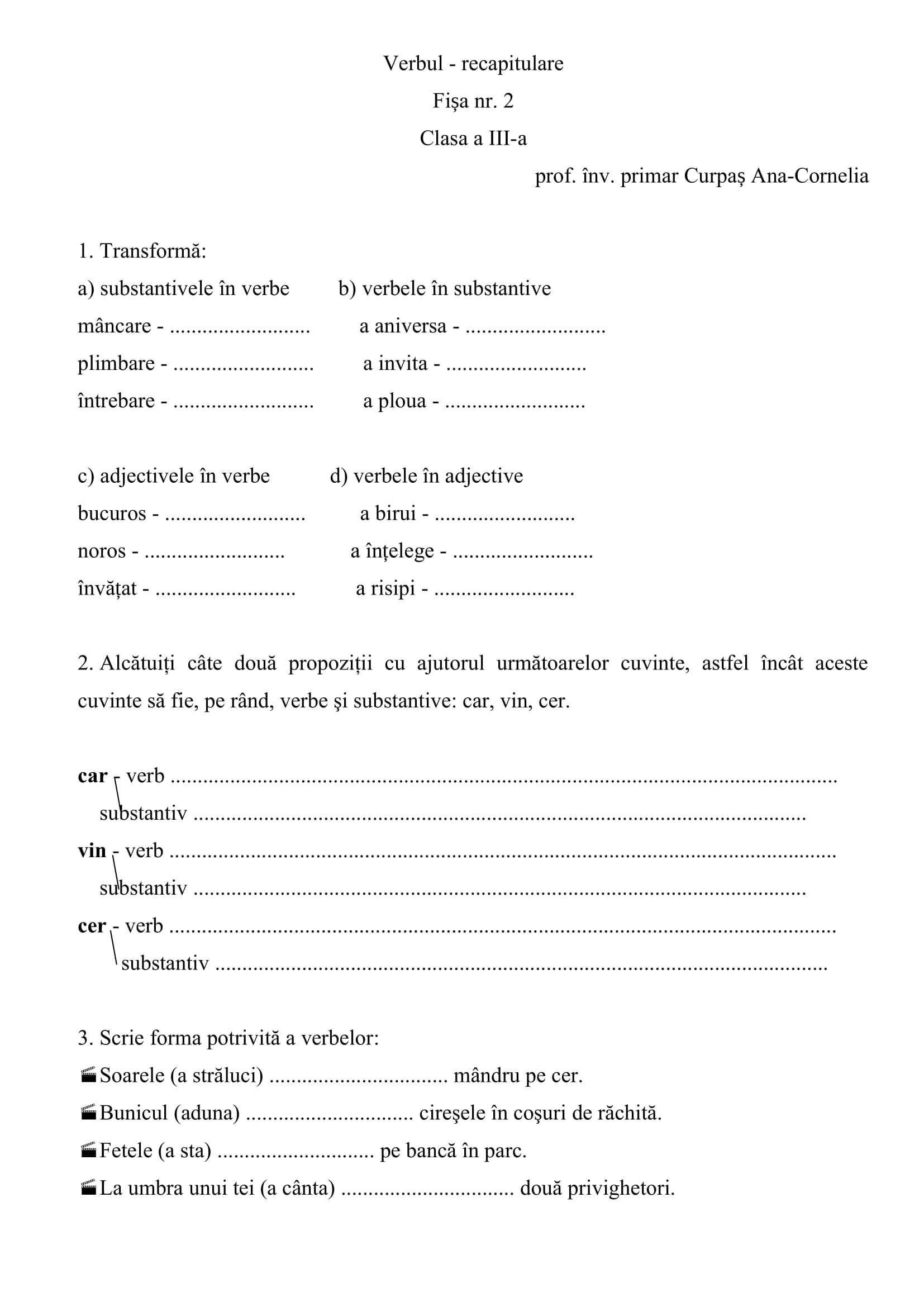 Fișă de lucru Clasa a III-a Verbul-recapitulare (varianta 2)Clasa a III-a, Clasele primare / Autor Cadru didactic Fisa-de-lucru-2-Romana-Clasa-a-III-a.doc (1 Descărcări ) Curpaș Ana-CorneliaProfesor învățământ primar la Școala Gimnazială ”Oltea Doamna” Oradea; Distribuie pe: 0 Distribuiri Facebook 0 Email Imprimă Copiază legătura
