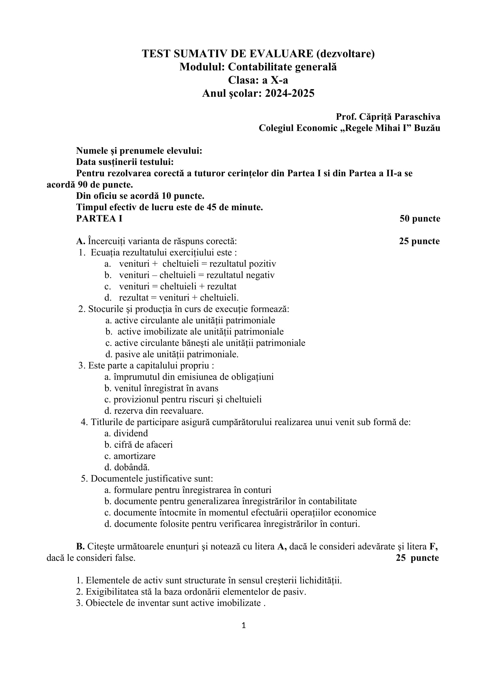 Test de evaluare Contabilitate generală Clasa a X-a (Dezvoltare)Clasa a X-a, Clasele liceale / Autor Cadru didactic Test-sumativ-de-evaluare-dezvoltare-clasa-a-X-a-Caprita-Paraschiva.doc (1 Descărcări ) Căpriță ParaschivaProfesor de Contabilitate la Colegiul Economic „Regele Mihai I” Buzău; Distribuie pe: 0 Distribuiri Facebook 0 Email Imprimă Copiază legătura