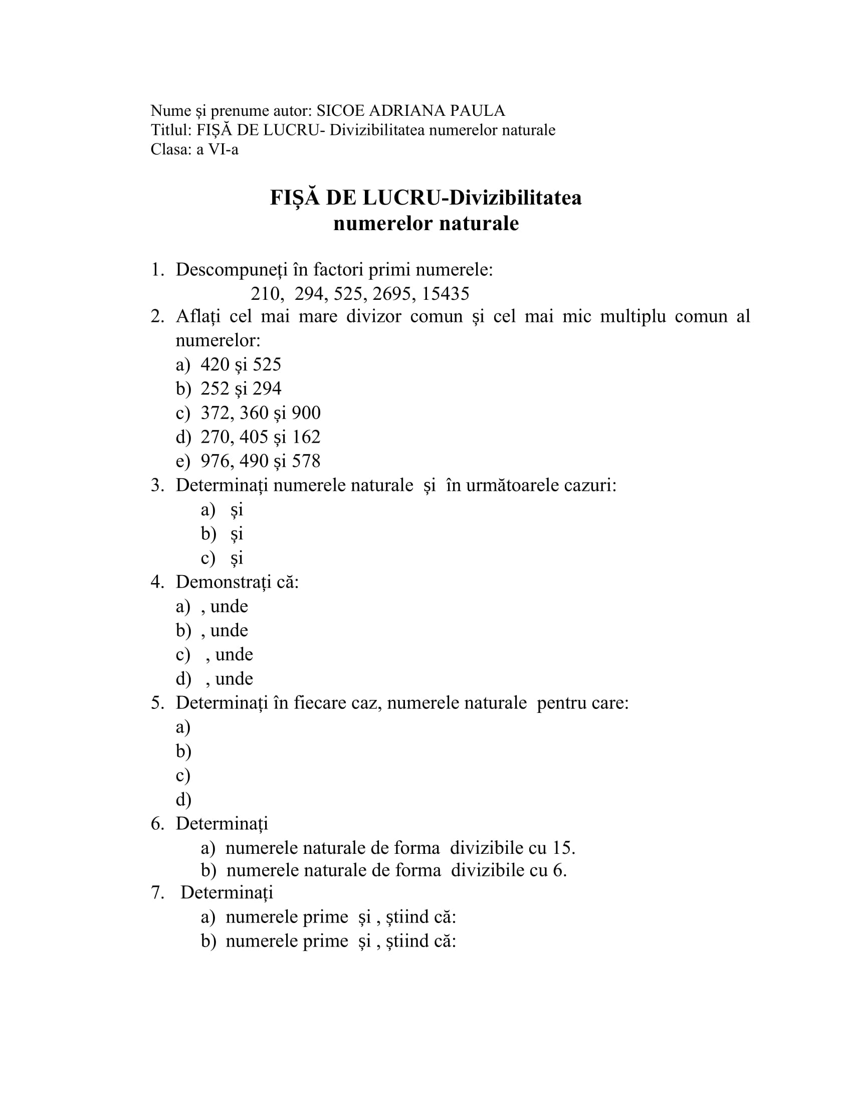 Fișă de lucru Clasa a VI-a Divizibilitatea numerlor naturale (Dezvoltare)Clasa a VI-a, Clasele gimnaziale, Matematică, Matematică / Autor Cadru didactic Fisa-de-lucru-Divizibilitatea-mumerelor-naturale.docx (1 Descărcări ) Sicoe Adriana PaulaProfesor de Matematică la Școala Gimnazială Vidra, localitatea Vidra, județul Alba; Distribuie pe: 0 Distribuiri Facebook 0 Email Imprimă Copiază legătura