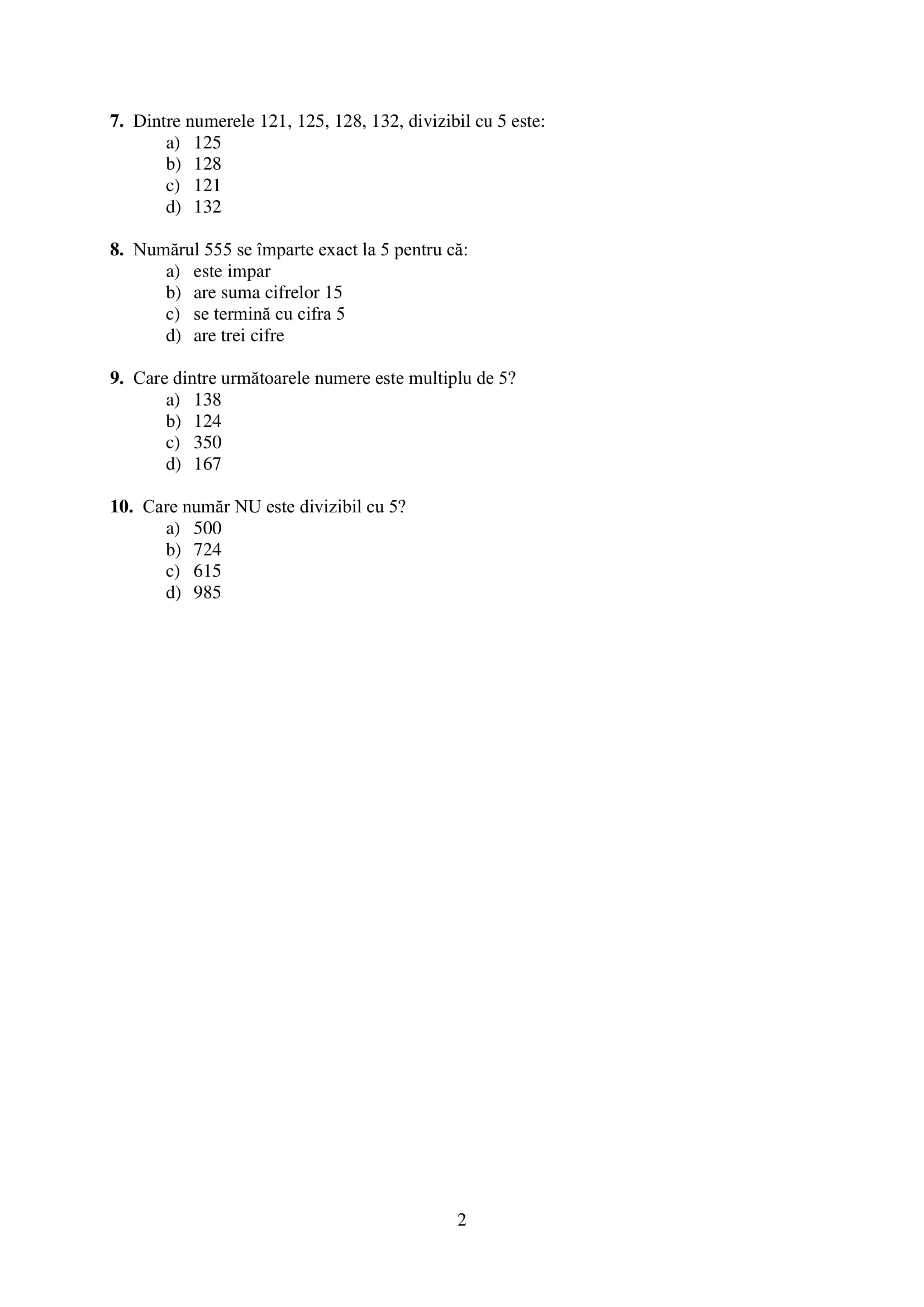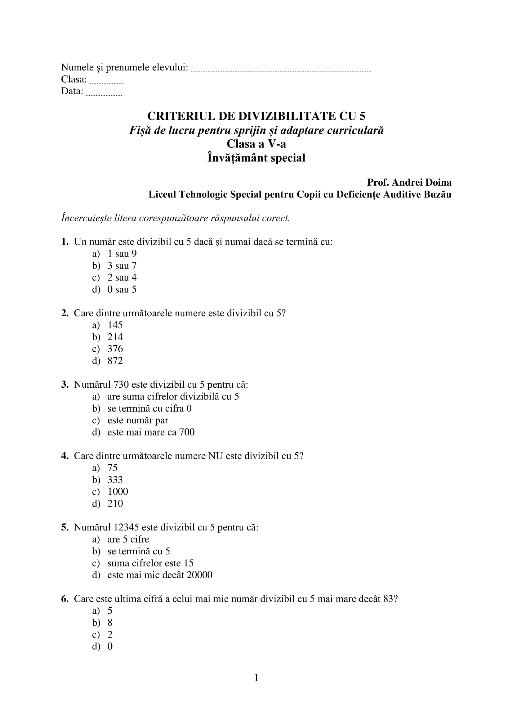 Fișă de lucru Clasa a V-a Învățământ special -Criteriul de divizibilitate cu 5( Sprijin și adaptare curriculară)