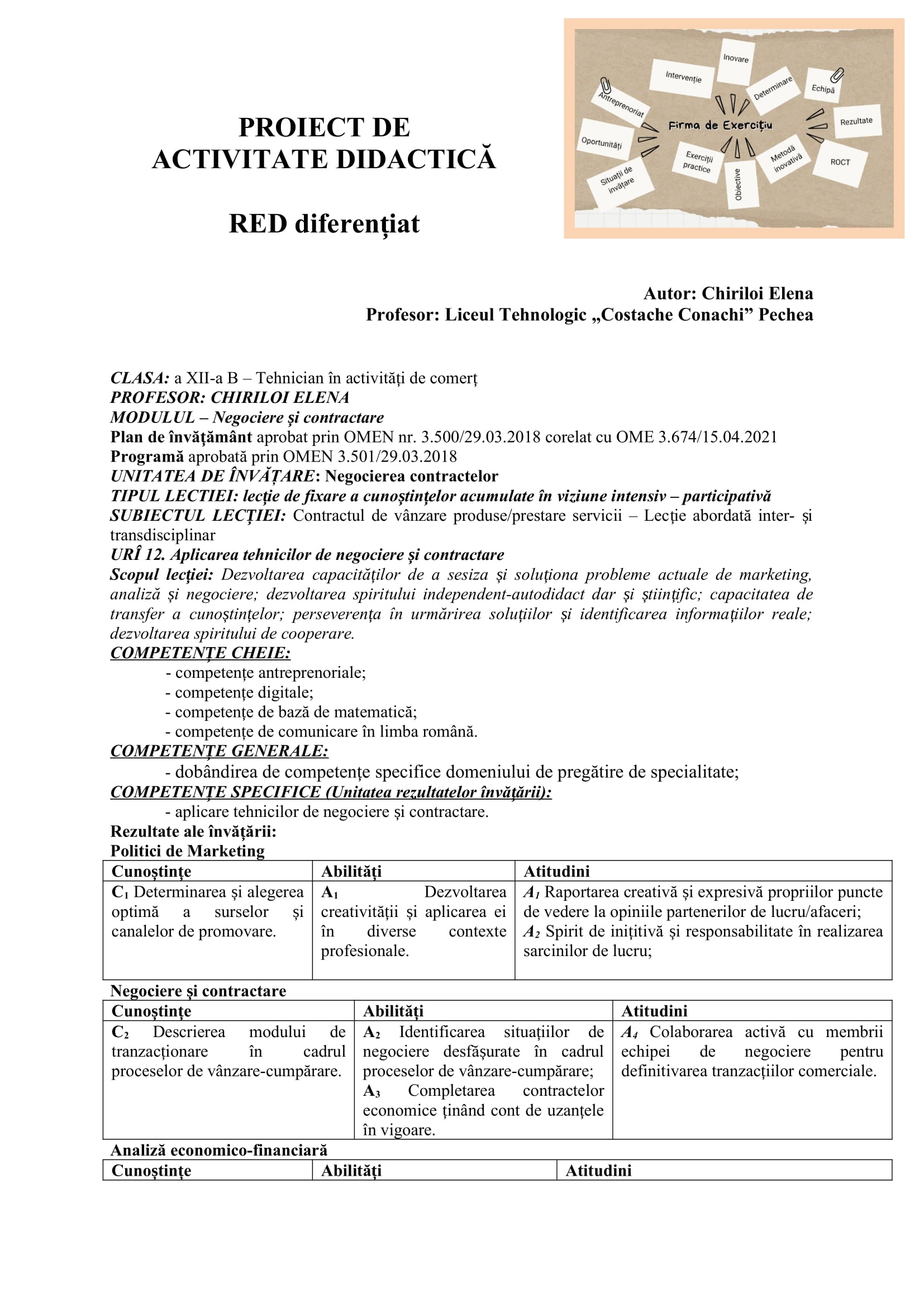 Proiect didactic Clasa a XII-a Modulul Negociere și contractareClasa a XII-a, Clasele liceale / Autor Cadru didactic RED-diferentiat_plan-de-lectie.docx (1 Descărcări ) Chiriloi ElenaProfesor la Liceul Tehnologic „Costache Conachi”; Distribuie pe: 0 Distribuiri Facebook 0 Email Imprimă Copiază legătura